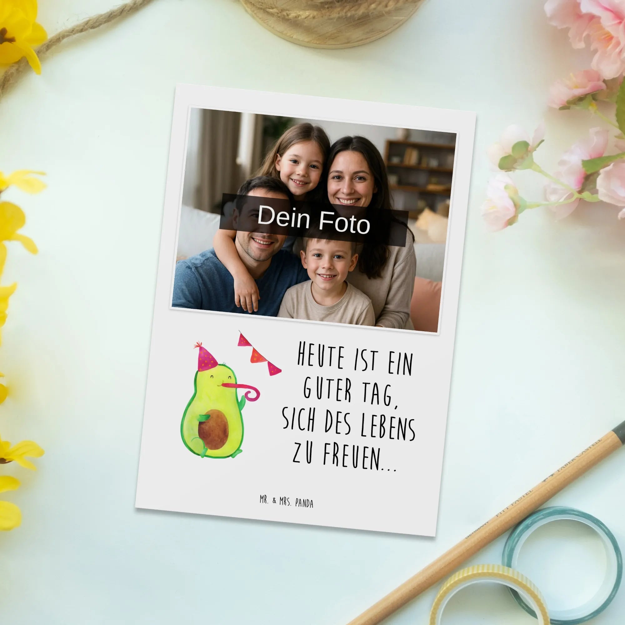 Die personalisierte Foto Postkarte "Avocado Party" von Mr. & Mrs. Panda ist der perfekte Begleiter für jeden Anlass. Egal ob Geburtstag, Jubiläum oder Prüfung – mit dieser besonderen Postkarte bringst du Freude und Freude ins Leben deiner Liebsten! Die niedliche Avocado, die einen Partyhut trägt und fröhlich in eine Partypfeife pustet, zaubert ein Lächeln auf jedes Gesicht.