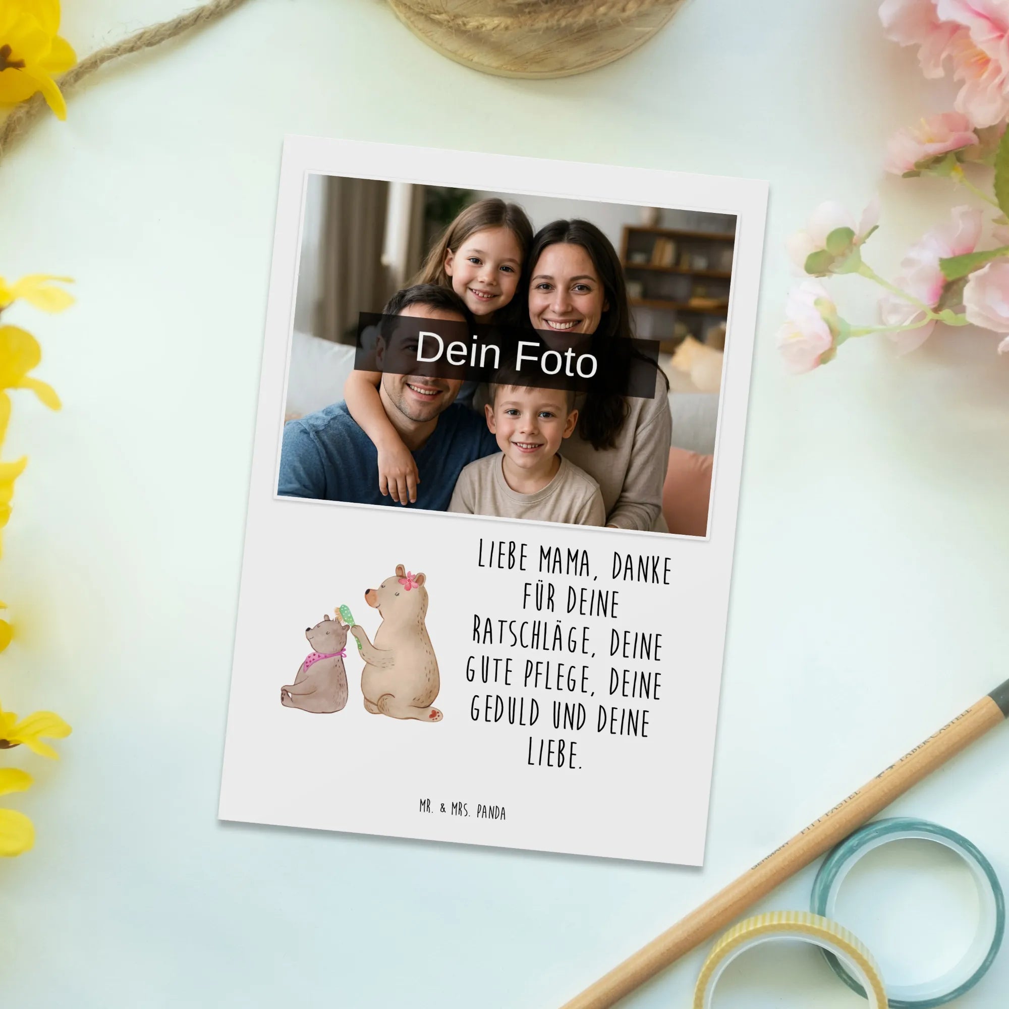 Entdecke die personalisierte Foto Postkarte von Mr. & Mrs. Panda mit dem niedlichen Motiv Bär mit Kind! Diese besondere Postkarte ist das perfekte Geschenk für all die wunderbaren Mamas da draußen. Egal ob zum Muttertag, Geburtstag oder einfach nur, um deiner Mutti zu sagen, wie viel sie dir bedeutet – diese Postkarte verleiht deinen Gefühlen einen besonderen Ausdruck.