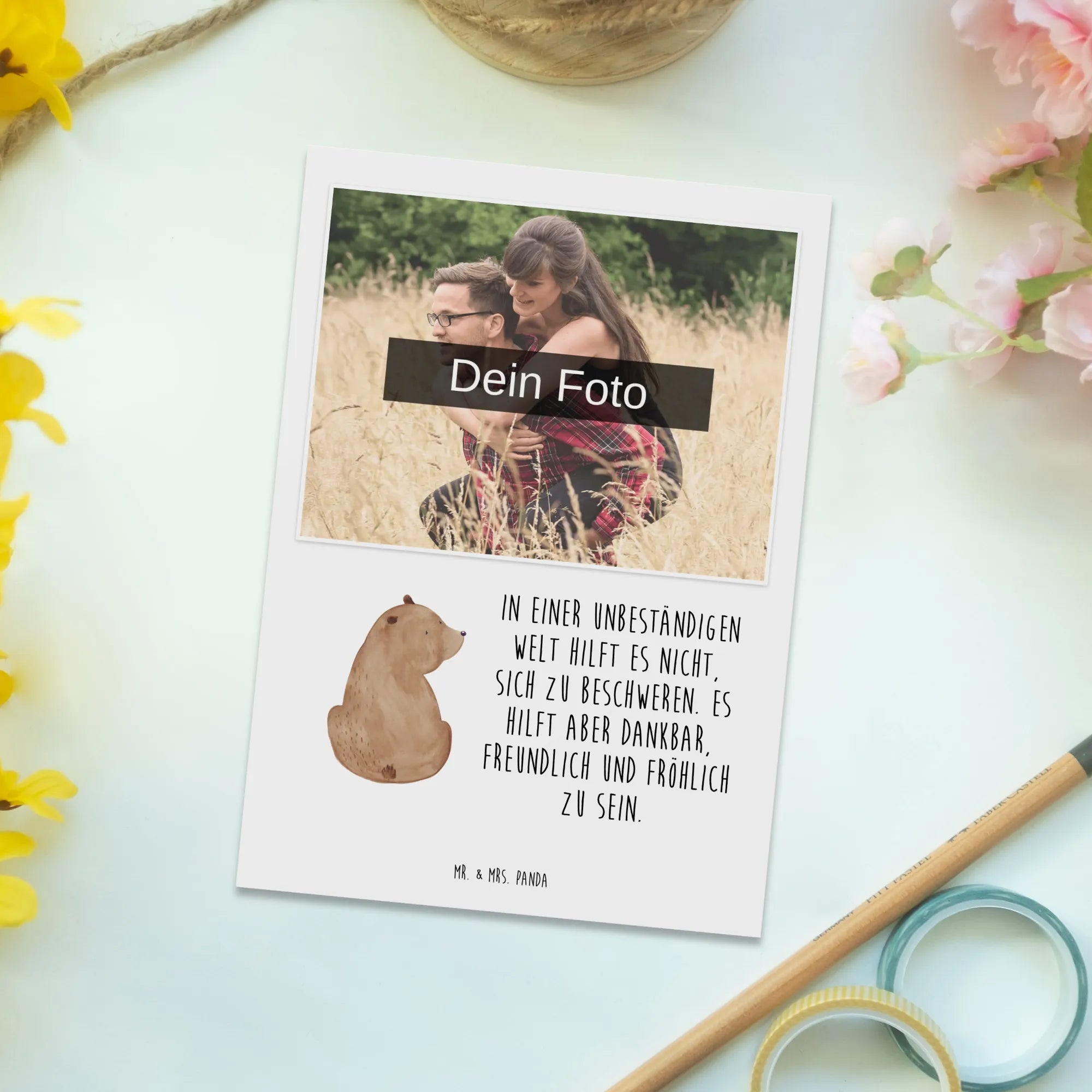 Und denk daran: Jedes Motiv und jeder Spruch wurde mit viel Liebe von Mrs. Panda handgezeichnet, sodass jede Karte ein Unikat ist! Die Kombination aus einem wundervollen Bären, viel Liebe und deinem persönlichen Foto macht diese Postkarte zu einem ganz besonderen Geschenk, das von Herzen kommt.
