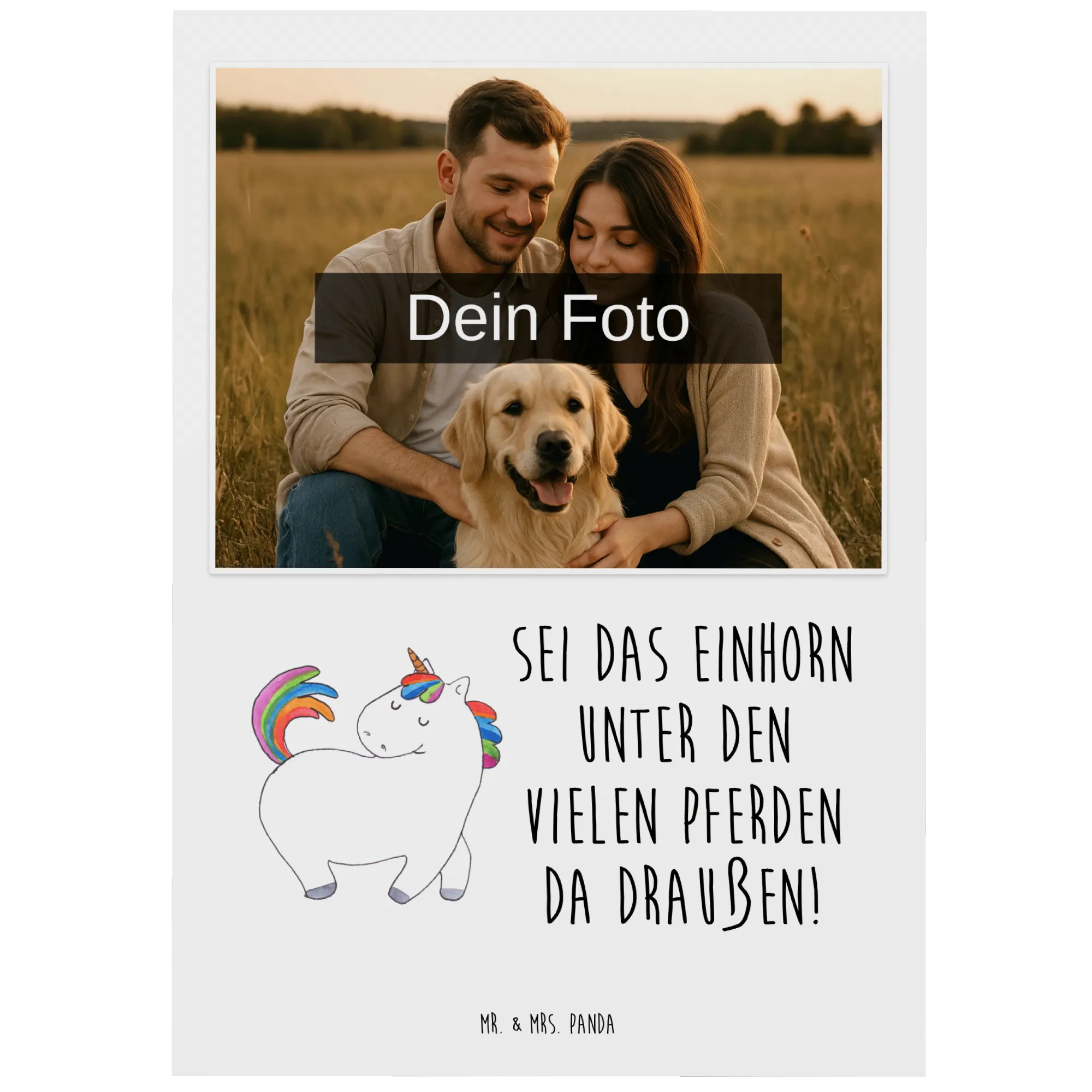 Die personalisierte Foto Postkarte "Einhorn stolzierend" aus der bezaubernden Einhorn-Kollektion von Mr. & Mrs. Panda ist das perfekte Geschenk für all jene, die sich durch ihre Einzigartigkeit auszeichnen möchten. Stelle dir vor, du kannst eine wunderschöne Postkarte mit deinem eigenen Foto versehen, die mit einem charismatischen Motiv eines stolzierenden Einhorns verziert ist. Dieses süße Einhorn strahlt Freude und Lebenslust aus und lädt dazu ein, die Welt mit einem Lächeln zu erkunden.