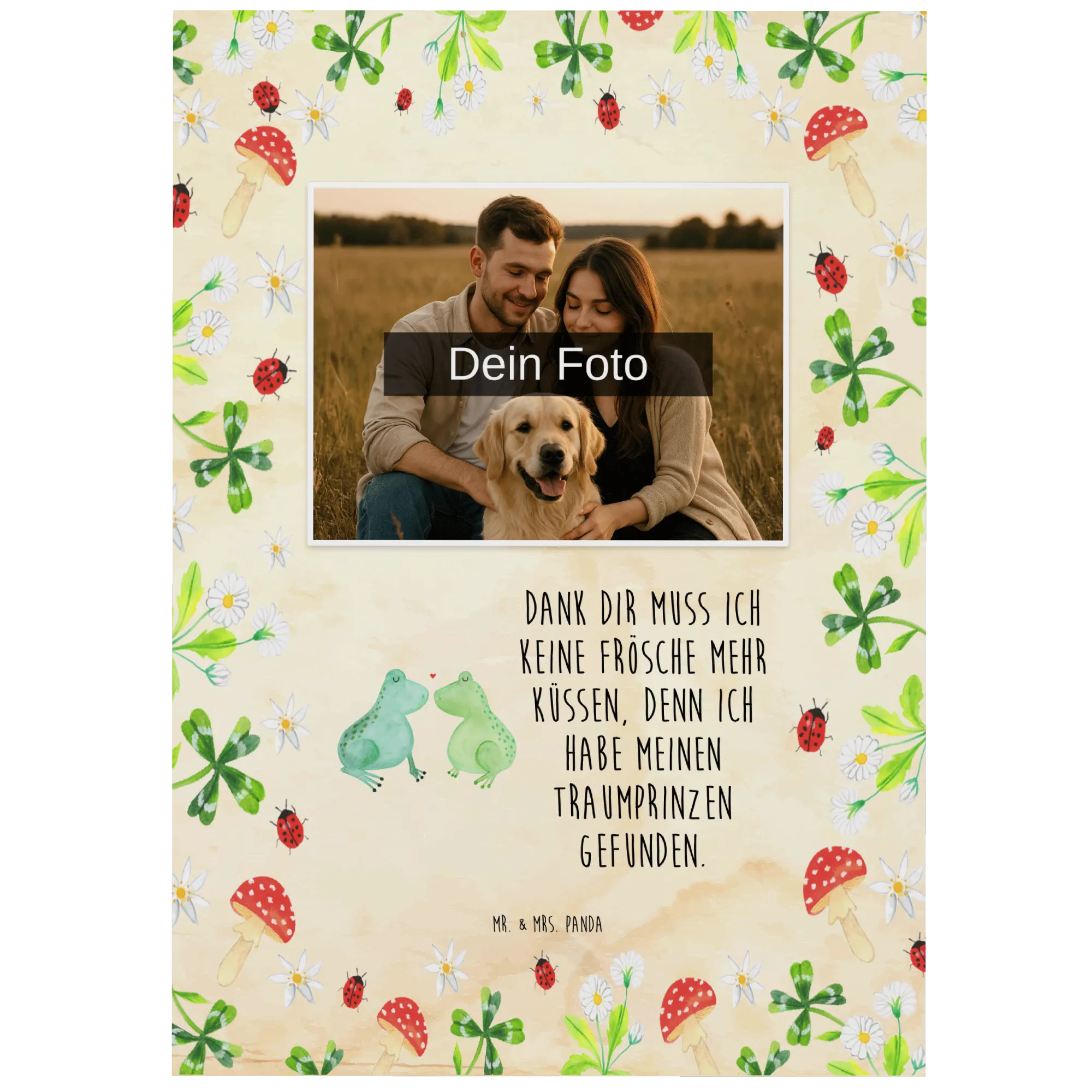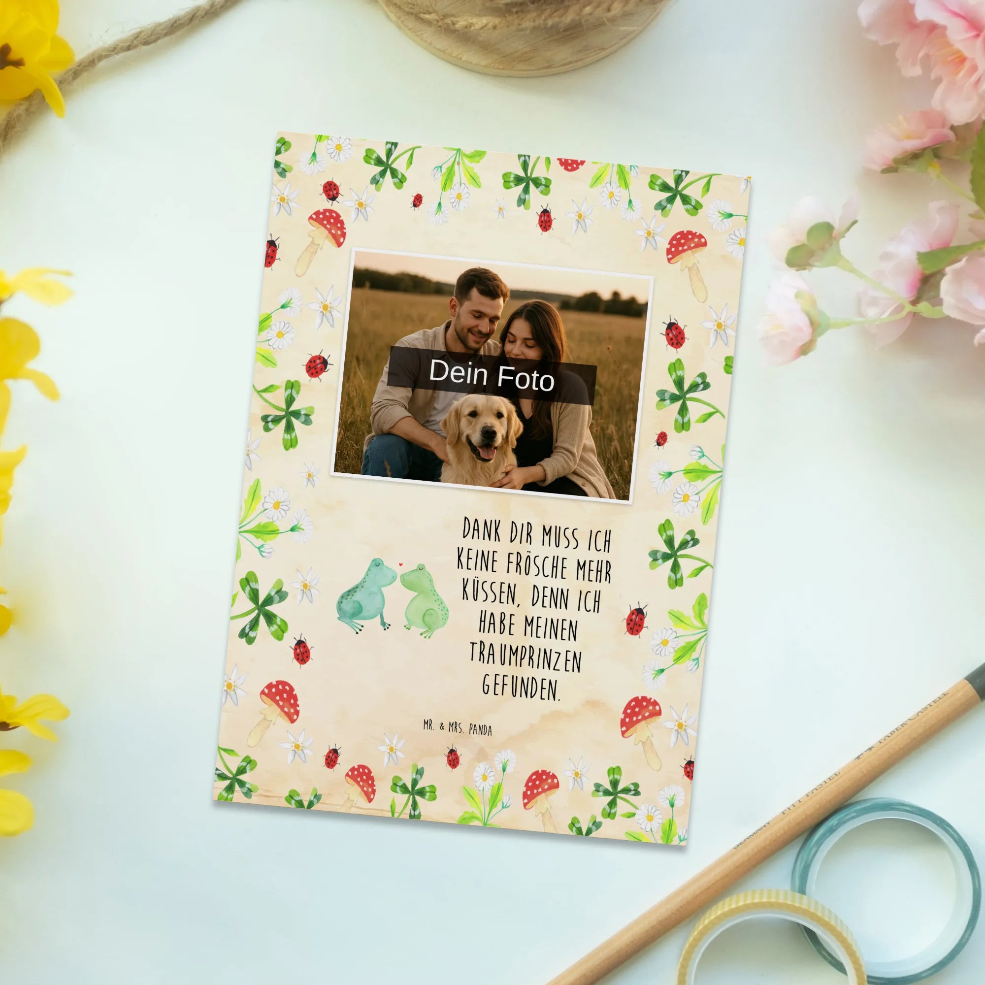 Suchst du ein liebevolles Geschenk für deinen Schatz? Unsere personalisierte Foto Postkarte „Frosch Liebe“ aus der Liebe-Kollektion von Mr. & Mrs. Panda ist der perfekte Liebesbeweis für Verliebte. Die handgezeichneten Frösche, das kleine rote Herz und der charmante Spruch „Dank dir muss ich keine Frösche mehr Küssen, denn ich habe meinen Traumprinzen gefunden.“ machen diese Postkarte zu einem zauberhaften Andenken für Jahrestag, Verlobung oder Hochzeitstag.
