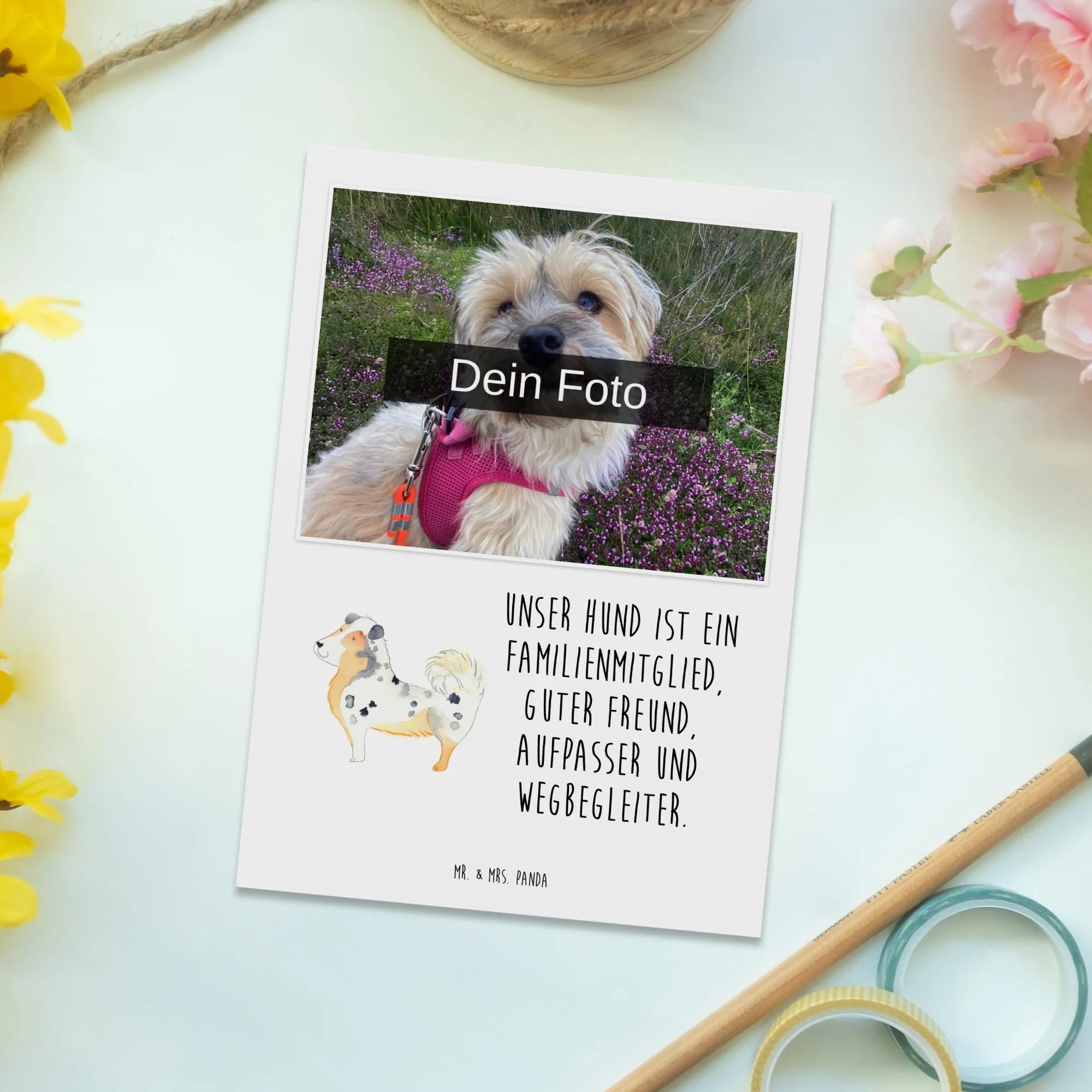 Du suchst nach einem ganz besonderen Geschenk für einen Hundeliebhaber? Dann ist unsere personalisierte Foto Postkarte mit dem Motif des Australien Shepherds genau das Richtige! Diese liebevolle Postkarte bringt die einzigartige Bindung zwischen Mensch und Hund perfekt zum Ausdruck. Unsere Hunde Kollektion vereint niedliche Motive und witzige Sprüche von Mr. & Mrs. Panda, die das Herz eines jeden Tierliebhabers höher schlagen lassen.