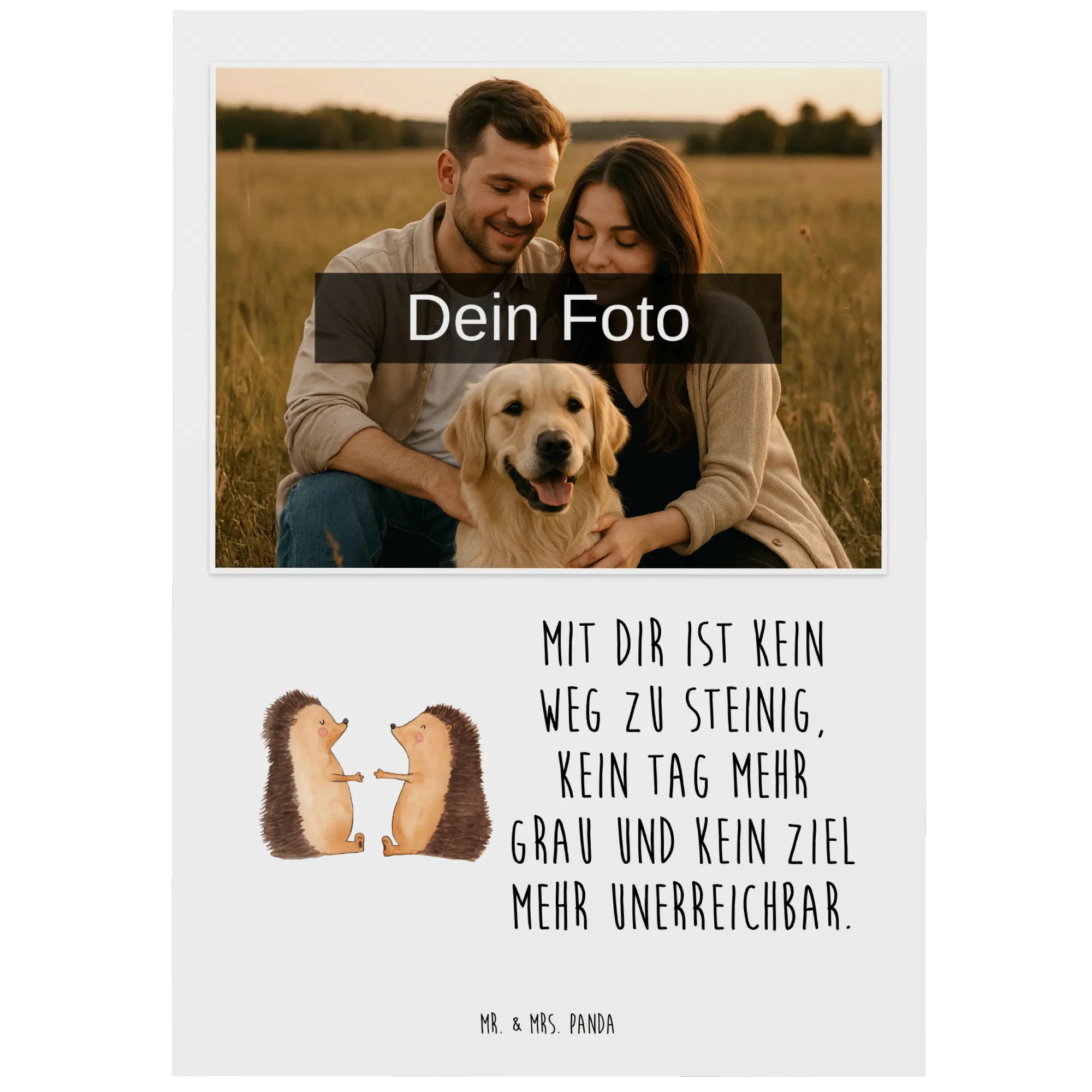 Die personalisierte Foto Postkarte "Igel Liebe" von Mr. & Mrs. Panda ist das perfekte Geschenk für Verliebte, Verlobte und frisch verheiratete Paare. Mit einem niedlichen Motif und dem liebevollen Spruch „Mit dir ist kein Weg zu steinig, kein Tag mehr grau und kein Ziel mehr unerreichbar“ weckt sie die süßesten Gefühle und zaubert jedem ein Lächeln ins Gesicht.