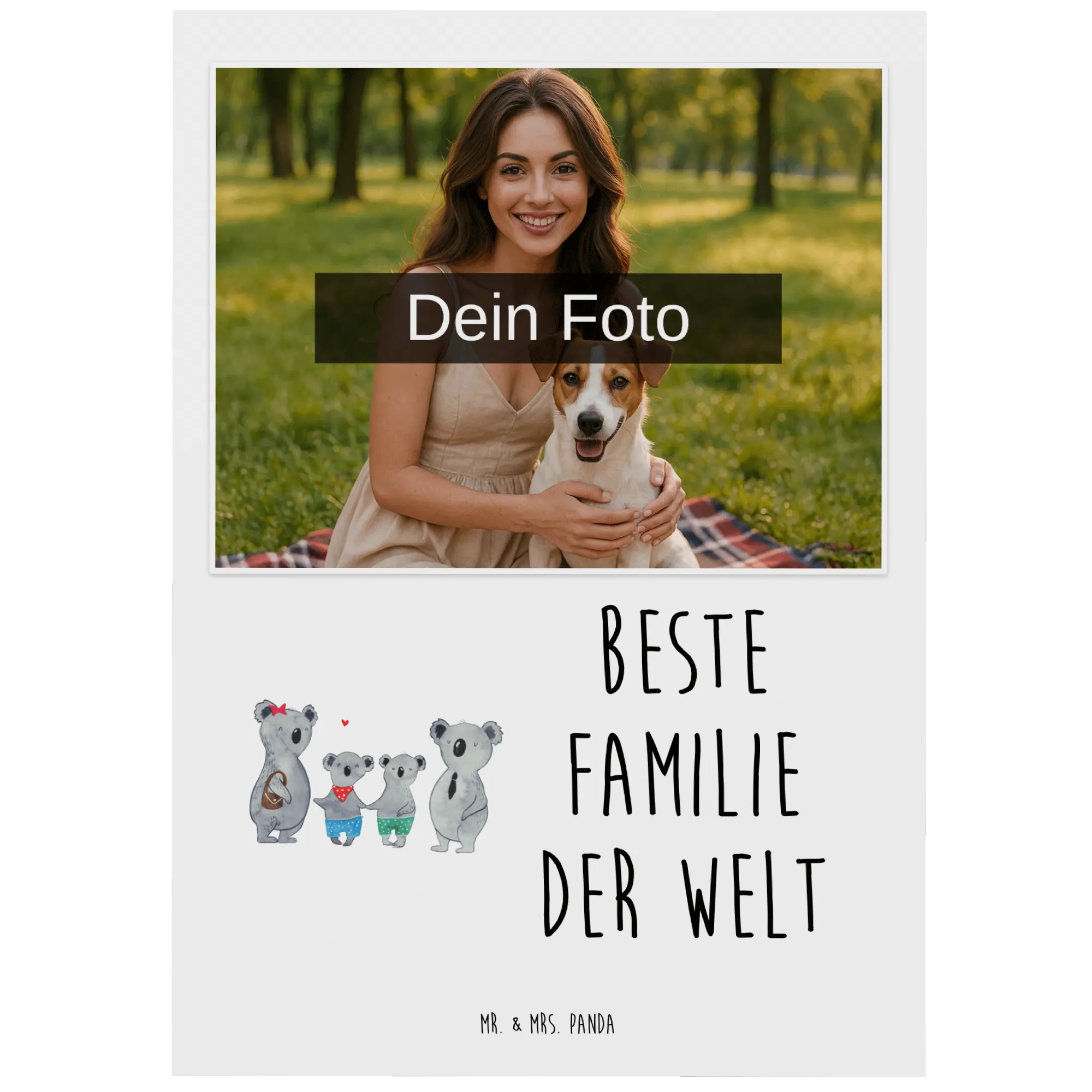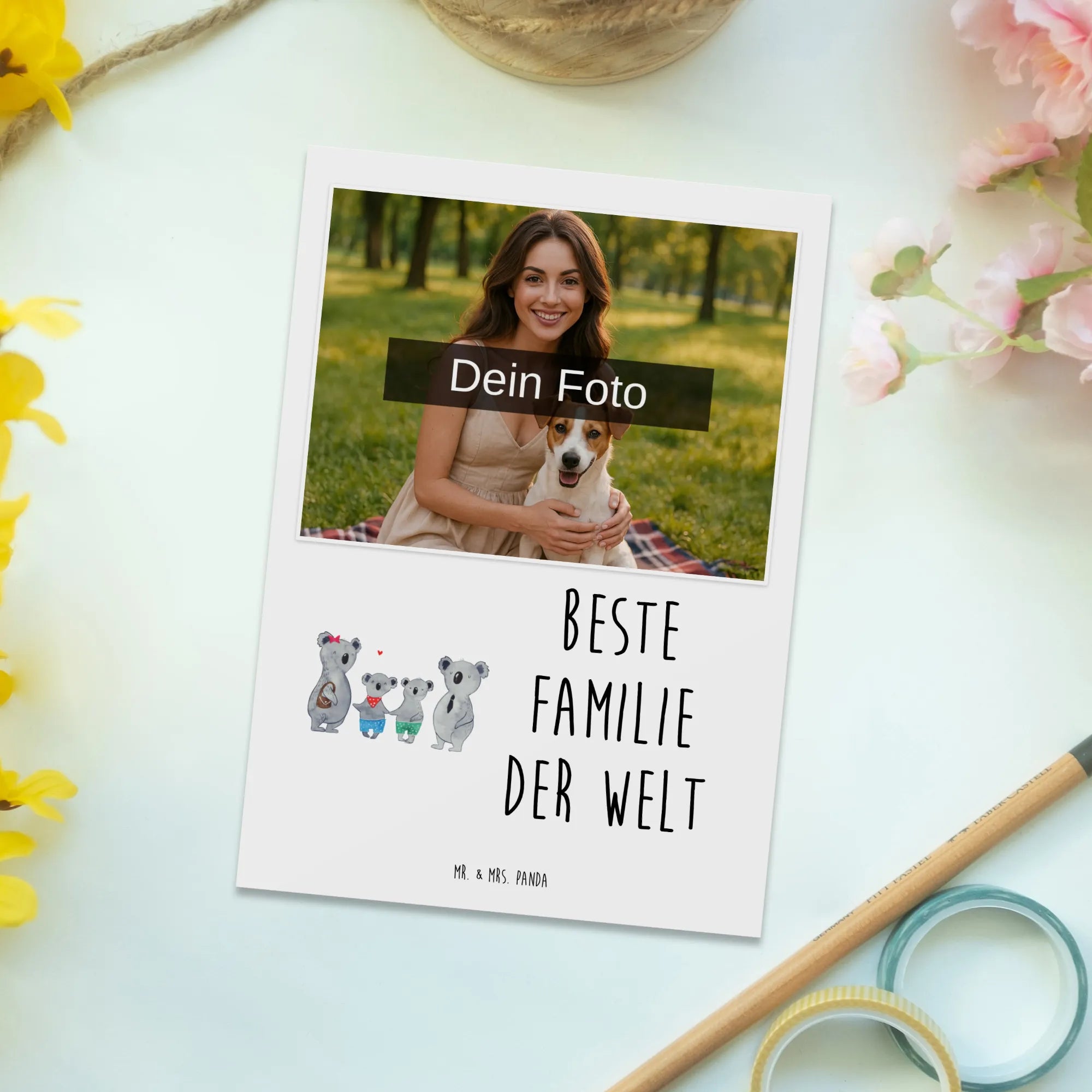 Die personalisierte Foto Postkarte "Koala Familie zwei" von Mr. & Mrs. Panda ist das perfekte Geschenk für jede Familie, die ihre besonderen Momente festhalten möchte. Diese liebevoll gestaltete Postkarte zeigt eine herzerwärmende Darstellung einer Koalafamilie, die den liebevollen Zusammenhalt in der Familie symbolisiert. Die größte Koala-Mutter mit einem roten Sternchen im Haar und eine fröhlich lächelnde Vater-Koala figur, gekleidet im Anzug, strahlen Glück und Zufriedenheit aus. Die beiden Kinderkoalas in bunten Shorts runden das charmante Bild ab.