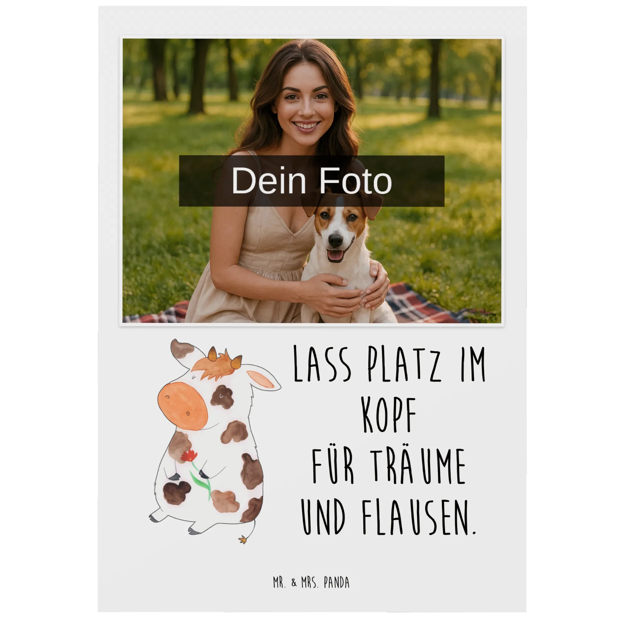 Du suchst nach dem perfekten Geschenk für einen Landwirtschafts- oder Tierliebhaber? Dann ist die personalisierte Foto Postkarte mit dem niedlichen Kuh-Motiv von Mr. & Mrs. Panda genau das Richtige! Diese einmalige Postkarte ist nicht nur ein Blickfang, sondern auch eine Botschaft voller Träume und Flausen: 'Lass Platz im Kopf für Träume und Flausen.'