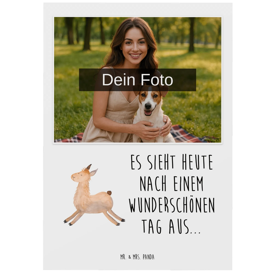 Stellen dir vor, wie dein persönliches Foto in Kombination mit dem süßen springenden Lama Druck jedem Tag einen Hauch Glück verleiht. Jeder Beschenkte wird sich freuen, eine solch einzigartige und persönliche Karte zu erhalten! Die Postkarte ist nicht nur hübsch anzusehen, sondern sie vermittelt auch eine positive Botschaft: "Es sieht heute nach einem wunderschönen Tag aus..." – ein perfekten Spruch, um den Tag gleich fröhlich zu beginnen!