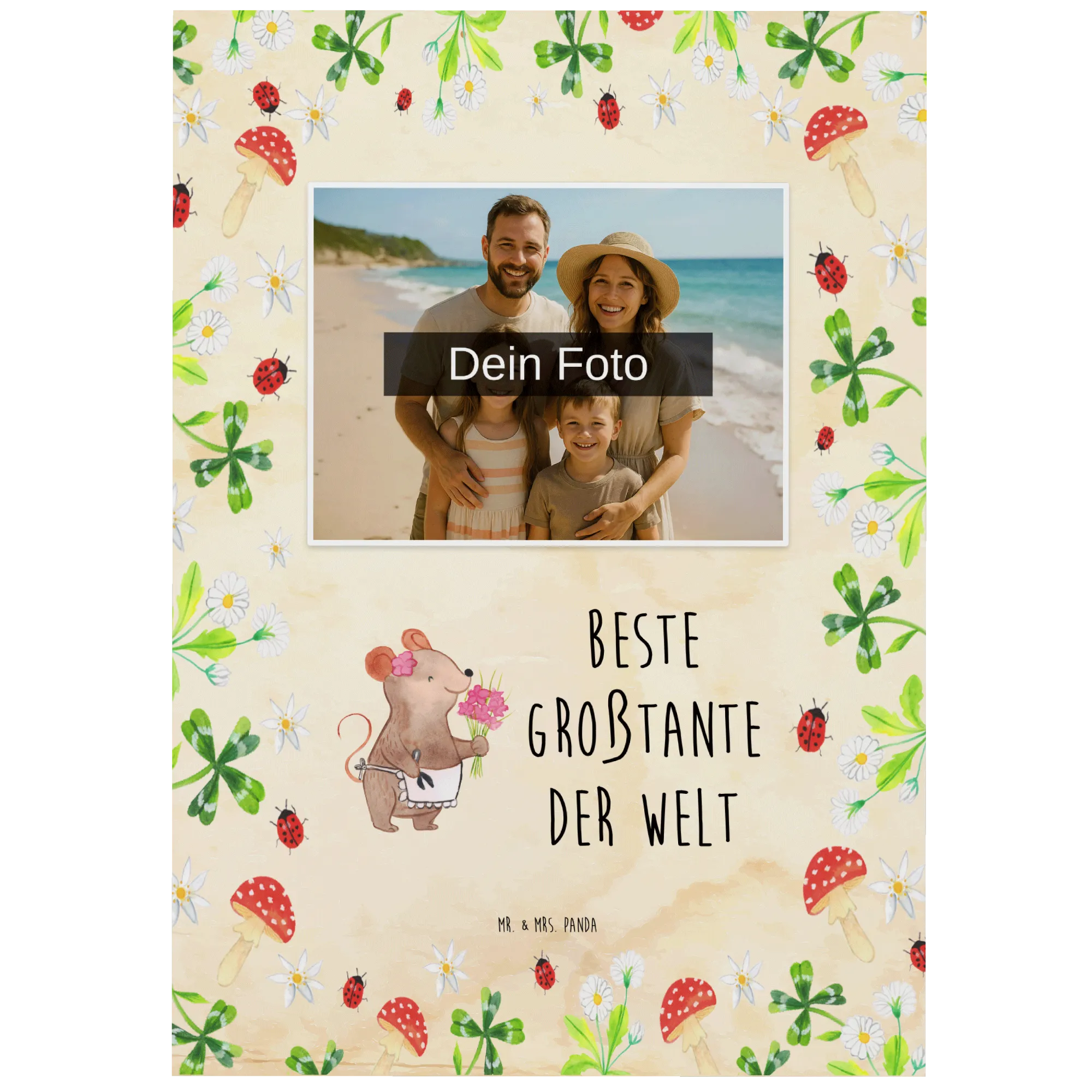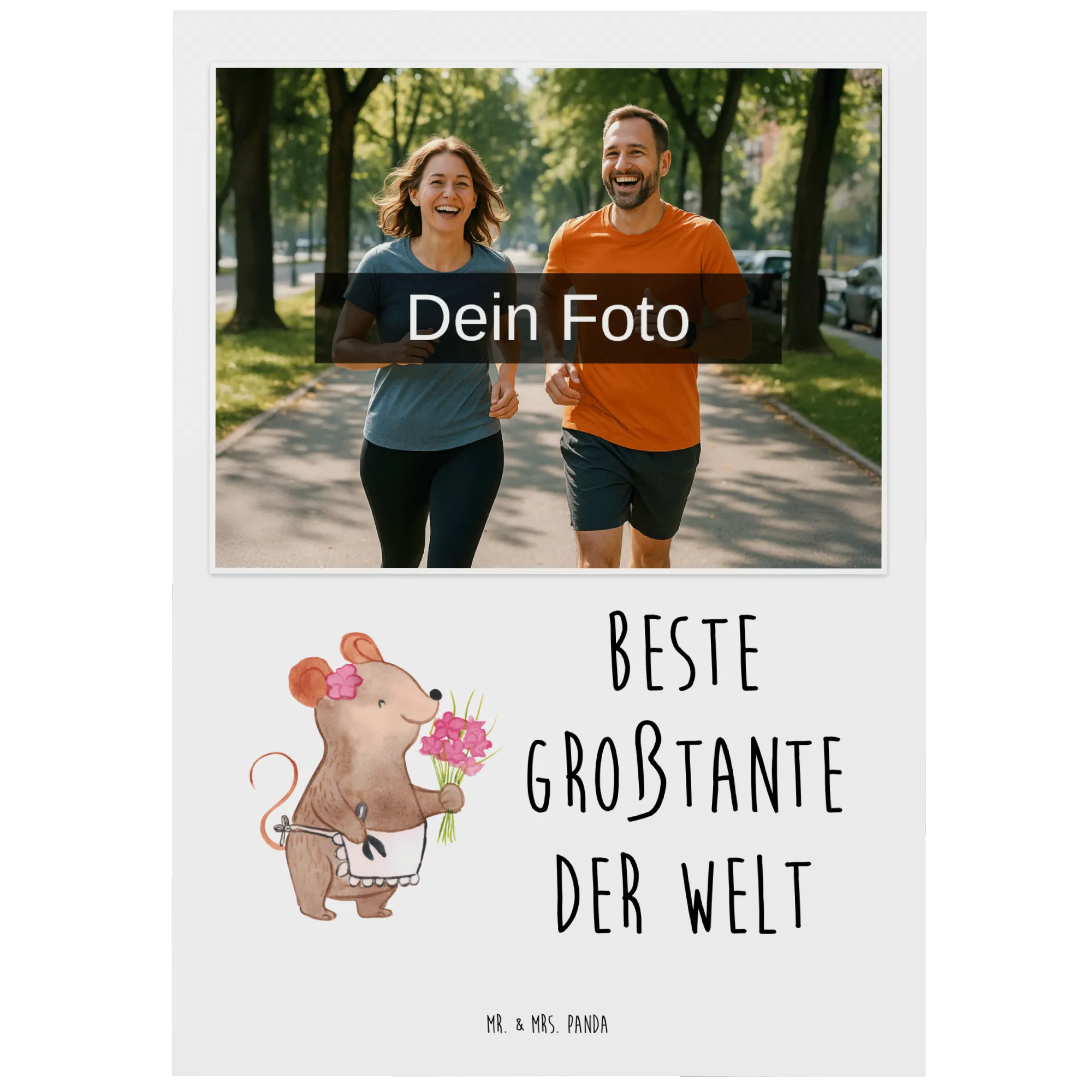 Die personalisierte Foto Postkarte "Maus Beste Großtante der Welt" von Mr. & Mrs. Panda ist das perfekte Geschenk für die liebste Großtante! Diese einzigartige Postkarte kombiniert ein wundervolles, handgezeichnetes Motiv mit dem herzlichen Slogan 'Beste Großtante der Welt'. Sie zeigt eine süße Maus, die stolz ihre Blumen präsentiert und sofort ein Lächeln auf das Gesicht deiner Tante zaubern wird.