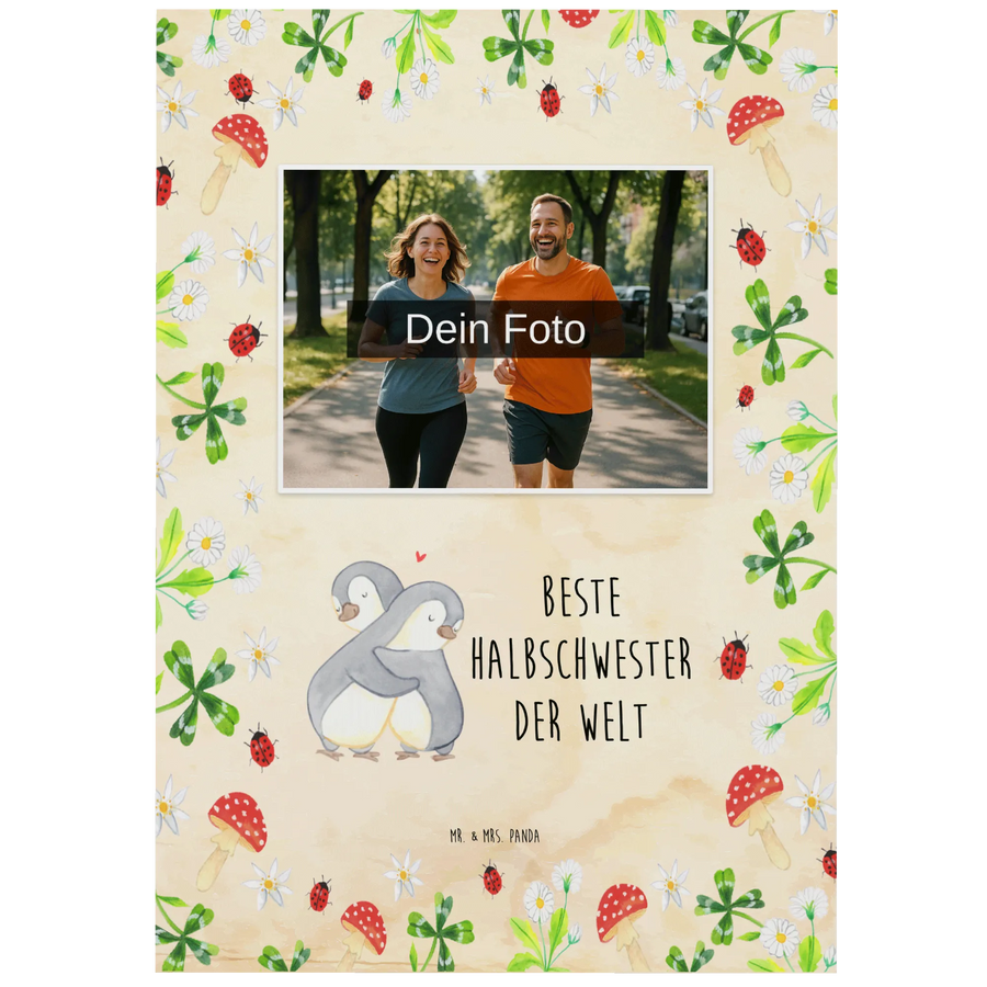 Die personalisierte Foto Postkarte "Pinguin Beste Halbschwester der Welt" von Mr. & Mrs. Panda ist das ideale Geschenk für alle, die eine besondere Bindung zu ihrer Halbschwester haben. Mit diesem bezaubernden Motiv, das zwei niedliche Pinguine zeigt, die sich im Arm halten, verschenkst du nicht nur ein Stück Kunst, sondern auch ein Stück Liebe, das von Herzen kommt.