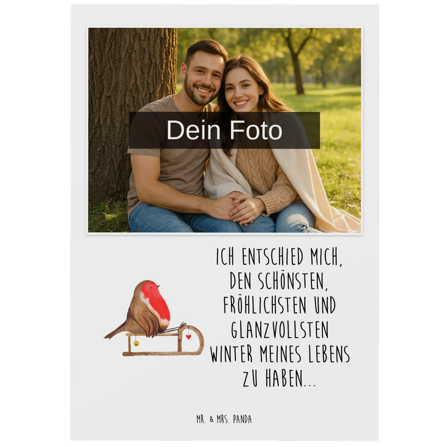Die personalisierte Foto Postkarte "Rotkehlchen Schlitten" aus der Winter Kollektion von Mr. & Mrs. Panda ist das perfekte Geschenk für die schönsten Momente im Winter. Egal ob zu Weihnachten, am Nikolaus oder einfach nur, um jemandem eine Freude zu bereiten, diese Karte bringt jeden zum Lächeln. Die liebevollen, handgezeichneten Motive von Mrs. Panda verzaubern und das süße Rotkehlchen auf seinem Schlitten ist einfach ein Blickfang!