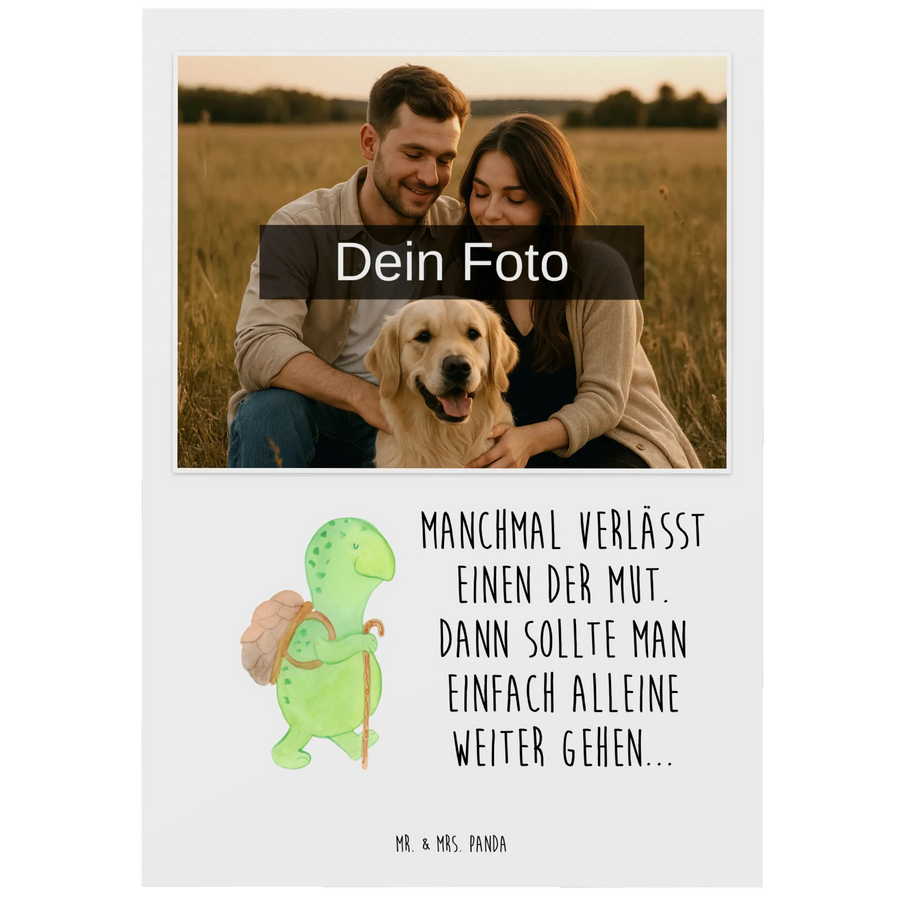 Die personalisierte Foto Postkarte mit dem süßen Schildkröten-Motiv von Mr. & Mrs. Panda ist der perfekte Begleiter für all deine besonderen Anlässe. Ob zum Geburtstag, zur Hochzeit oder einfach nur als liebevolle Geste – diese einzigartige Postkarte wird Herzen höherschlagen lassen! Die niedliche Schildkröte, die ihren Panzer als kleinen Rucksack trägt und mit einem Gehstock einen Spaziergang macht, inspiriert dich, neue Wege zu gehen und das Leben in vollen Zügen zu genießen. Zudem kommt das schöne Motiv mit einem ansprechenden Motivationsspruch: „Manchmal verlässt einen der Mut. Dann sollte man einfach alleine weiter gehen…“ Diese Botschaft ist ideal für jemanden, der einen Neuanfang wagt oder eine kleine Ermutigung gebrauchen kann.