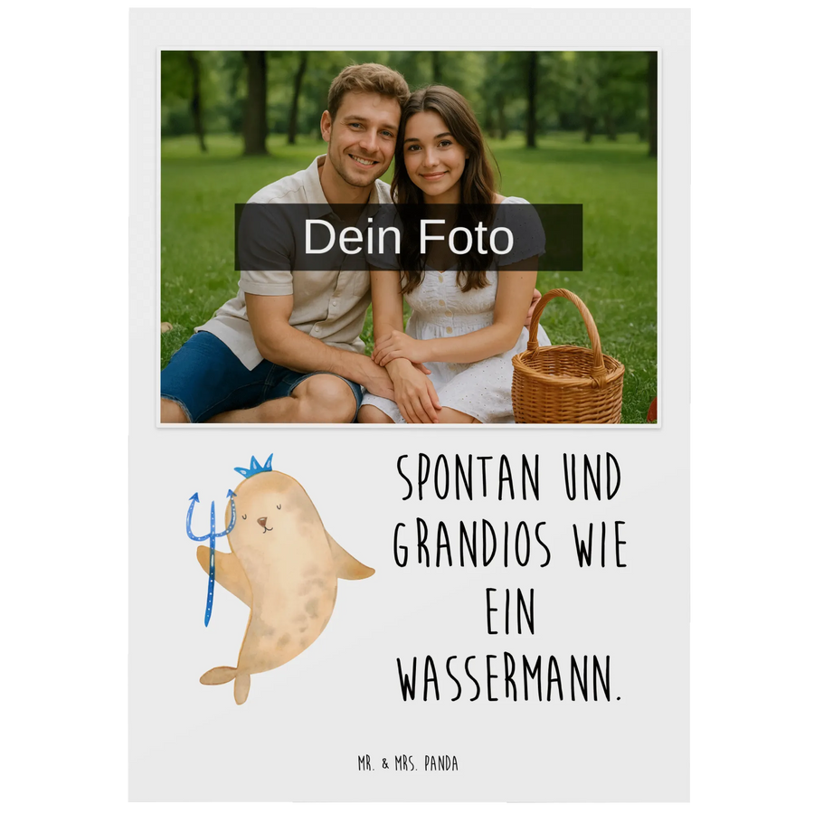Versende Glück mit Persönlichkeit! Unsere personalisierte Foto Postkarte Sternzeichen Wassermann verbindet das niedliche, handgezeichnete Motiv von Mr. & Mrs. Panda mit deinem eigenen Foto und dem frechen Slogan „Spontan und grandios wie ein Wassermann.“ 🌊✨