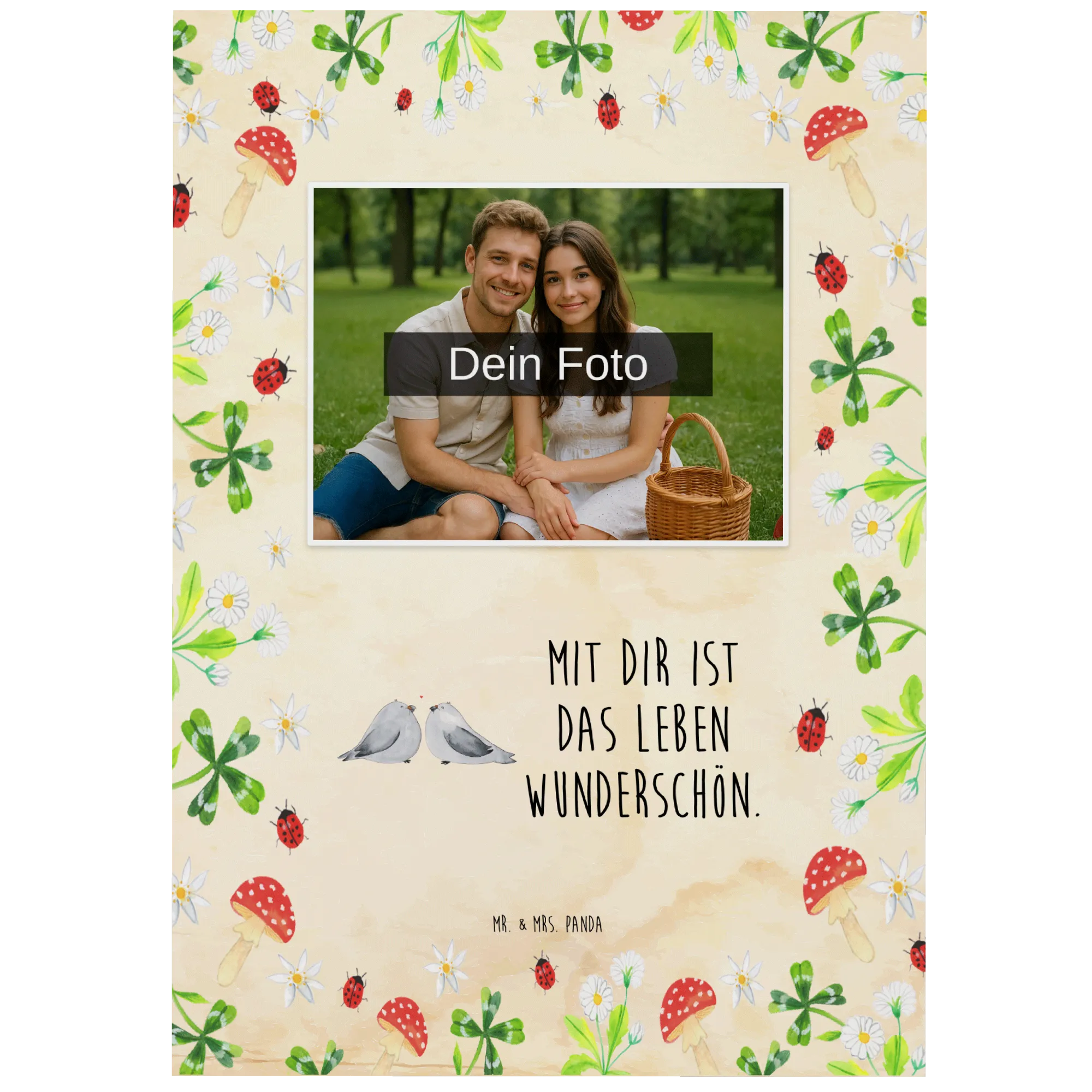 Unsere Personalisierte Foto Postkarte „Turteltauben Liebe“ aus der Liebe Kollektion von Mr. & Mrs. Panda verbindet Dein Foto mit einem zarten, handgezeichneten Motiv. Zwei innig verliebte Turteltäubchen, ein kleines rotes Herz und der liebevolle Spruch „Mit dir ist das Leben wunderschön.“ – mehr Romantik geht kaum. Diese Karte ist das perfekte Geschenk für Freundin, Freund, Ehemann oder Ehefrau.