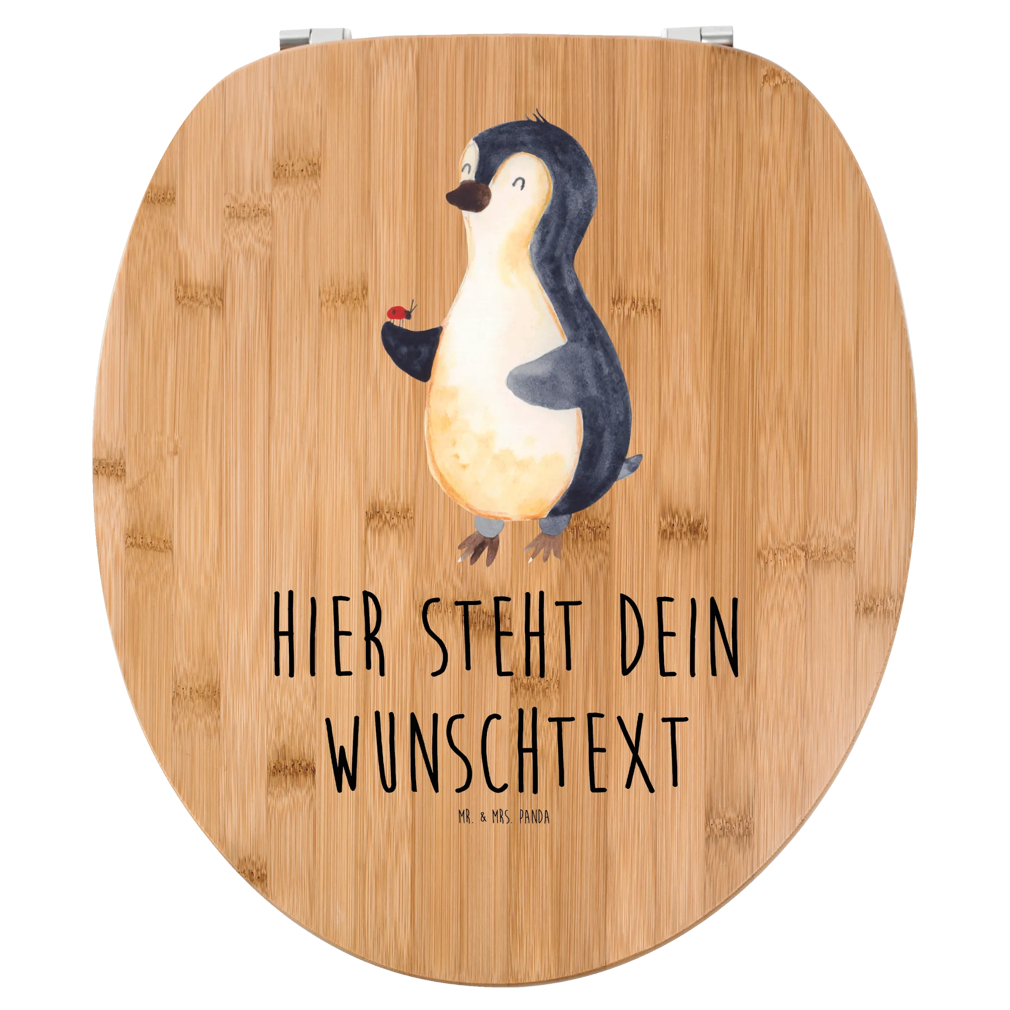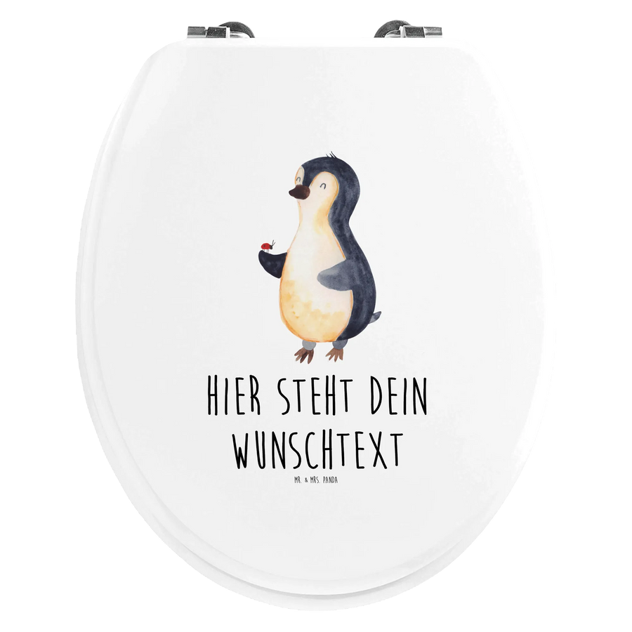 Willkommen in der zauberhaften Welt der personalisierten WC Sitze von Mr. & Mrs. Panda! Hier stellen wir dir unseren wunderschönen personalisierten WC Sitz mit dem fröhlichen Pinguin-Motiv und dem charmanten Marienkäfer vor. Dieser Toilettendeckel wird nicht nur dein Badezimmer aufpeppen, sondern auch ein echtes Unikat, das deinen persönlichen Stil zum Ausdruck bringt. Der Pinguin, der einen putzigen Marienkäfer auf seiner Flosse hält, symbolisiert Freude und Lebensfreude. Mit dem liebevollen Slogan "Glaube an Wunder, Liebe und Glück." zaubert dieser WC Sitz garantiert ein Lächeln auf dein Gesicht.