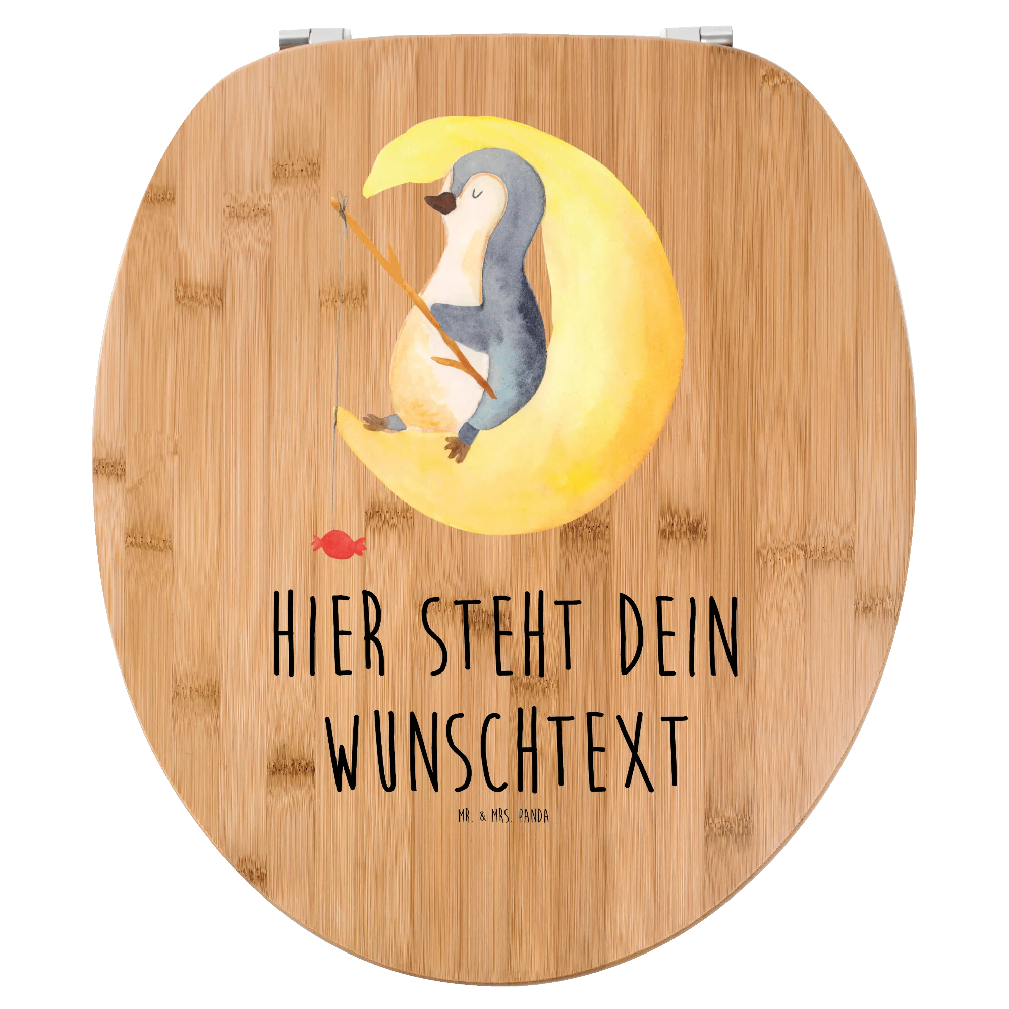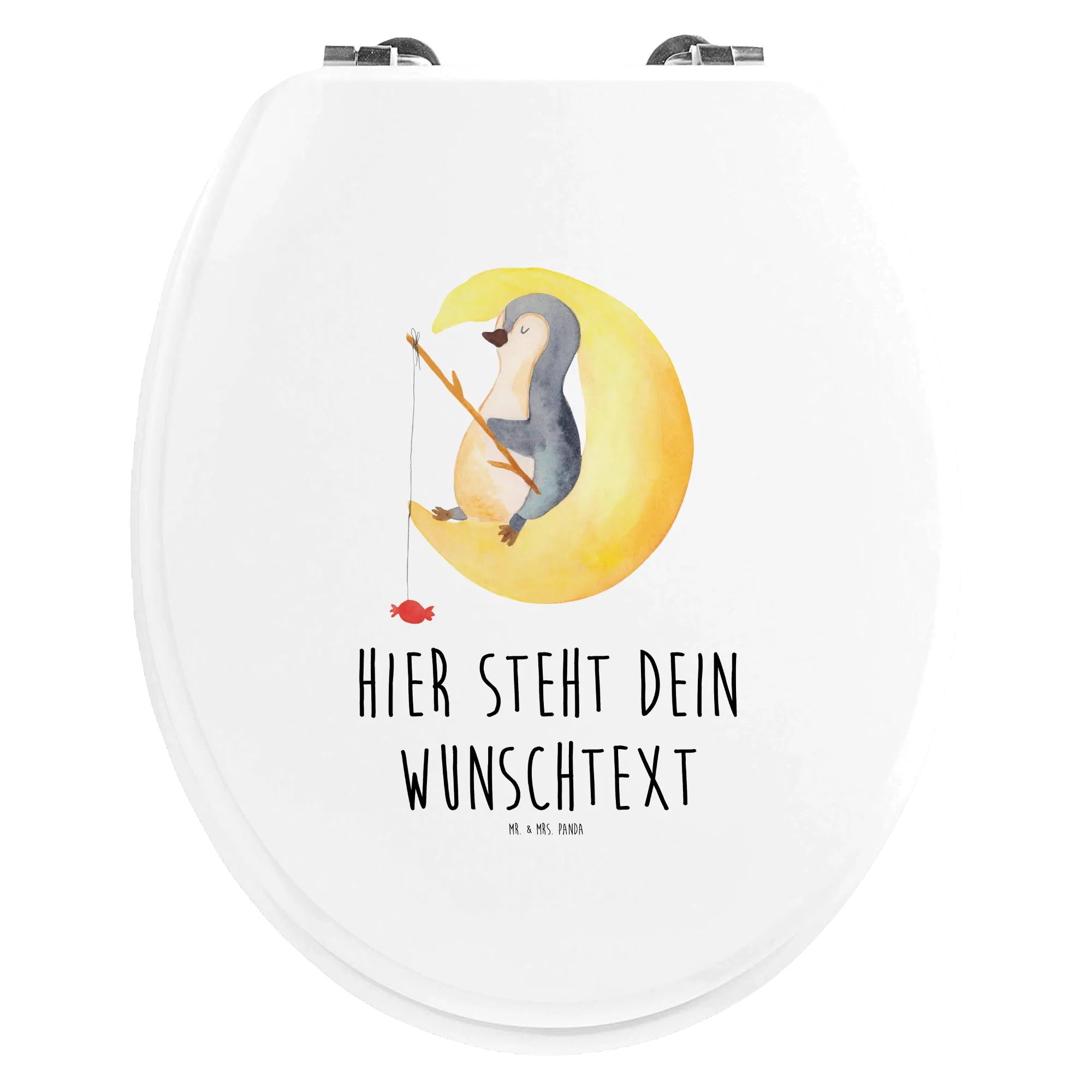 Der süße Pinguin auf der Mondsichel, der angelt, während er nach Sternen greift, wird nicht nur dich, sondern auch deine Gäste verzaubern. Personalisiere ihn mit deinem Wunschnamen oder Wunschtext – das macht den Toilettendeckel zu einem ganz persönlichen Geschenk!