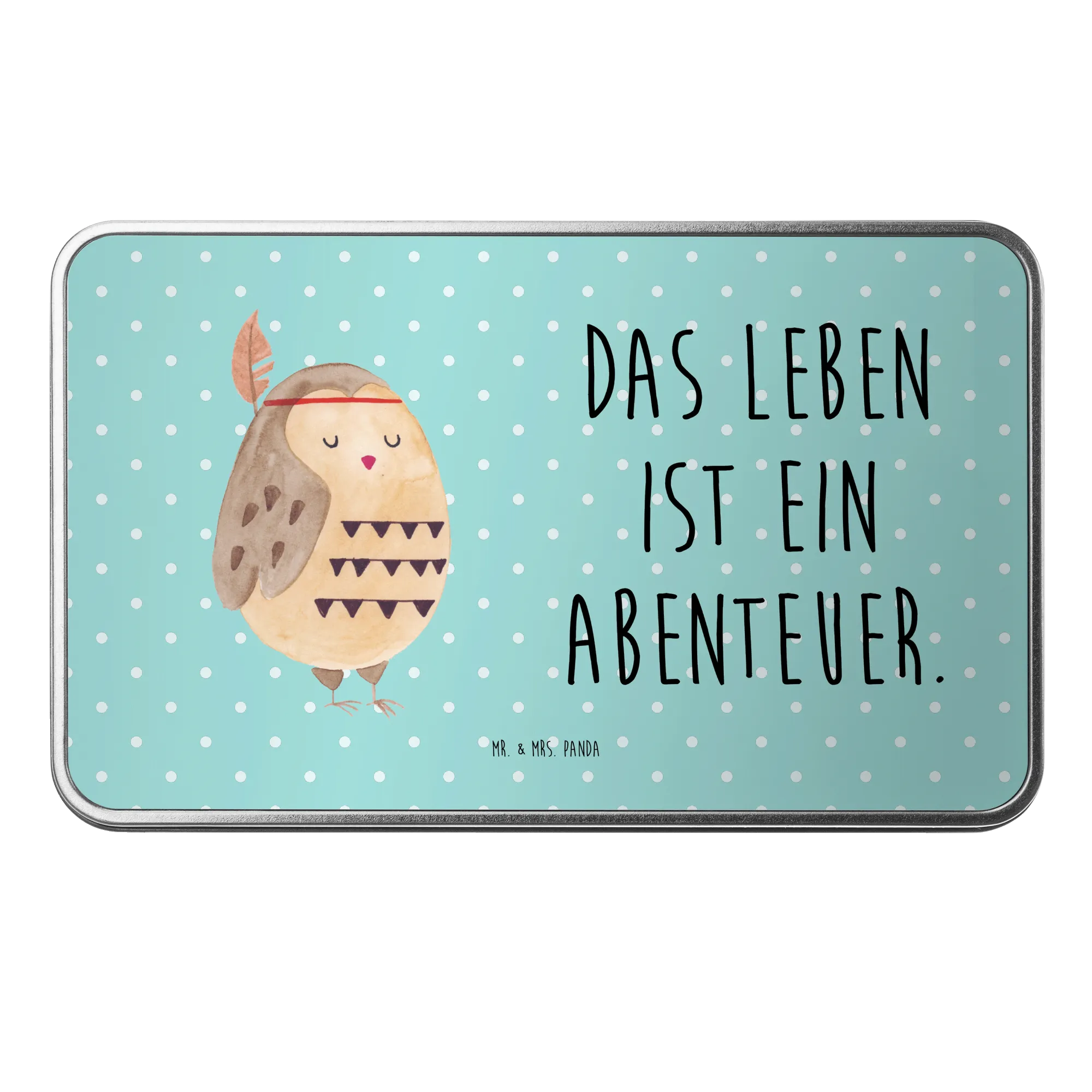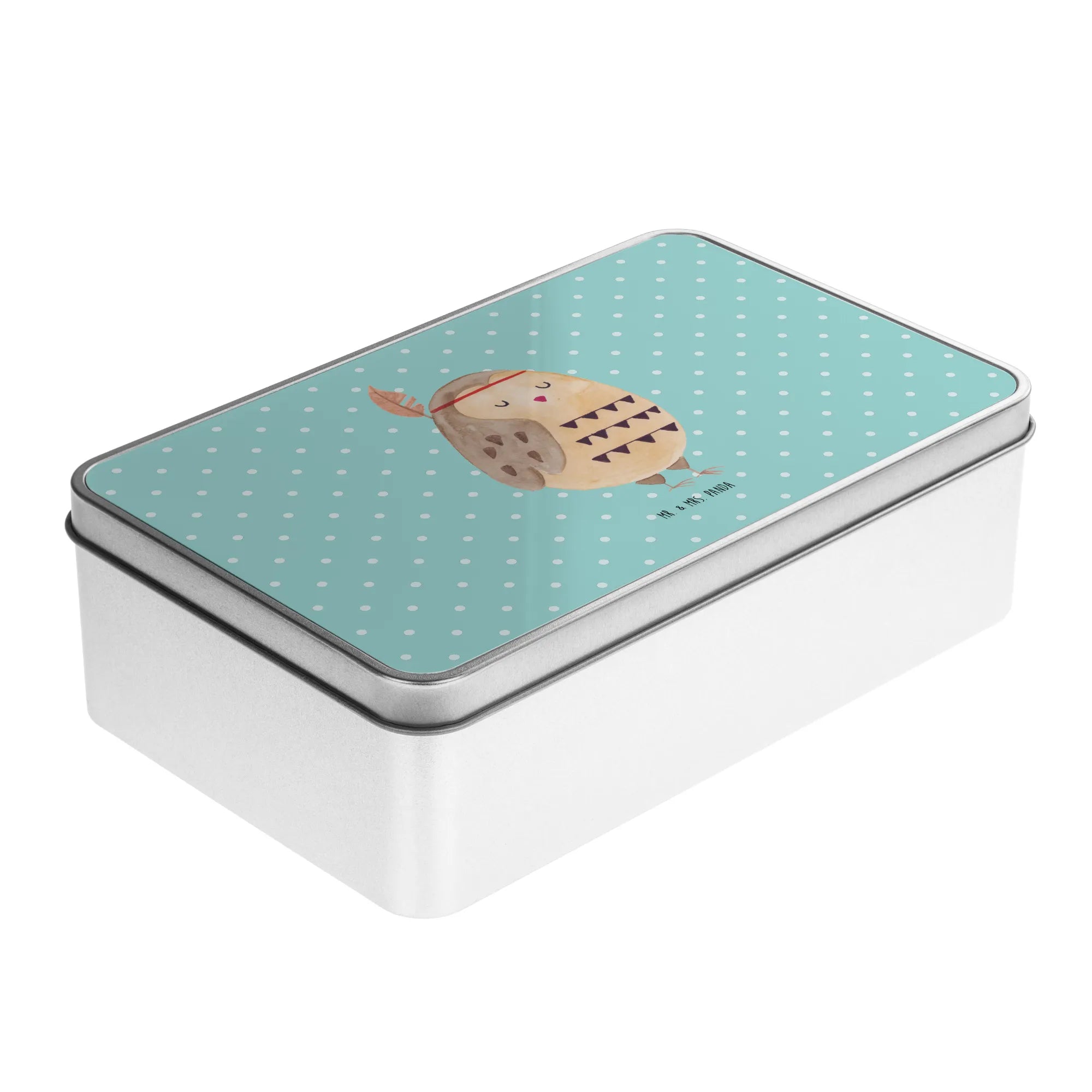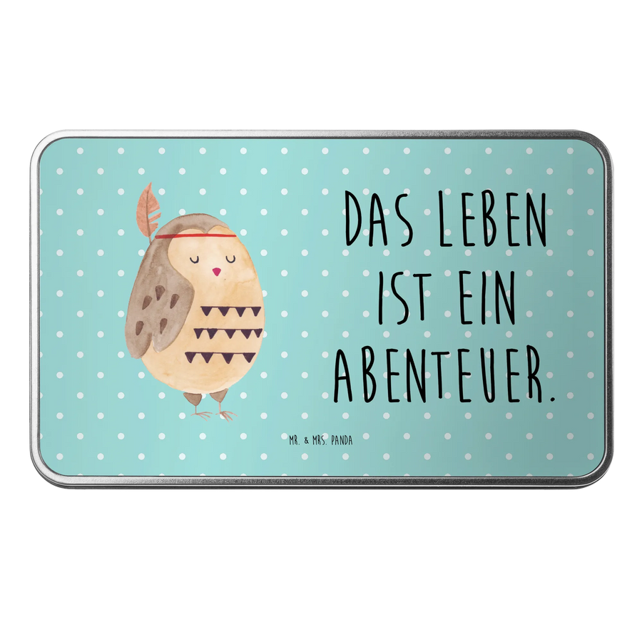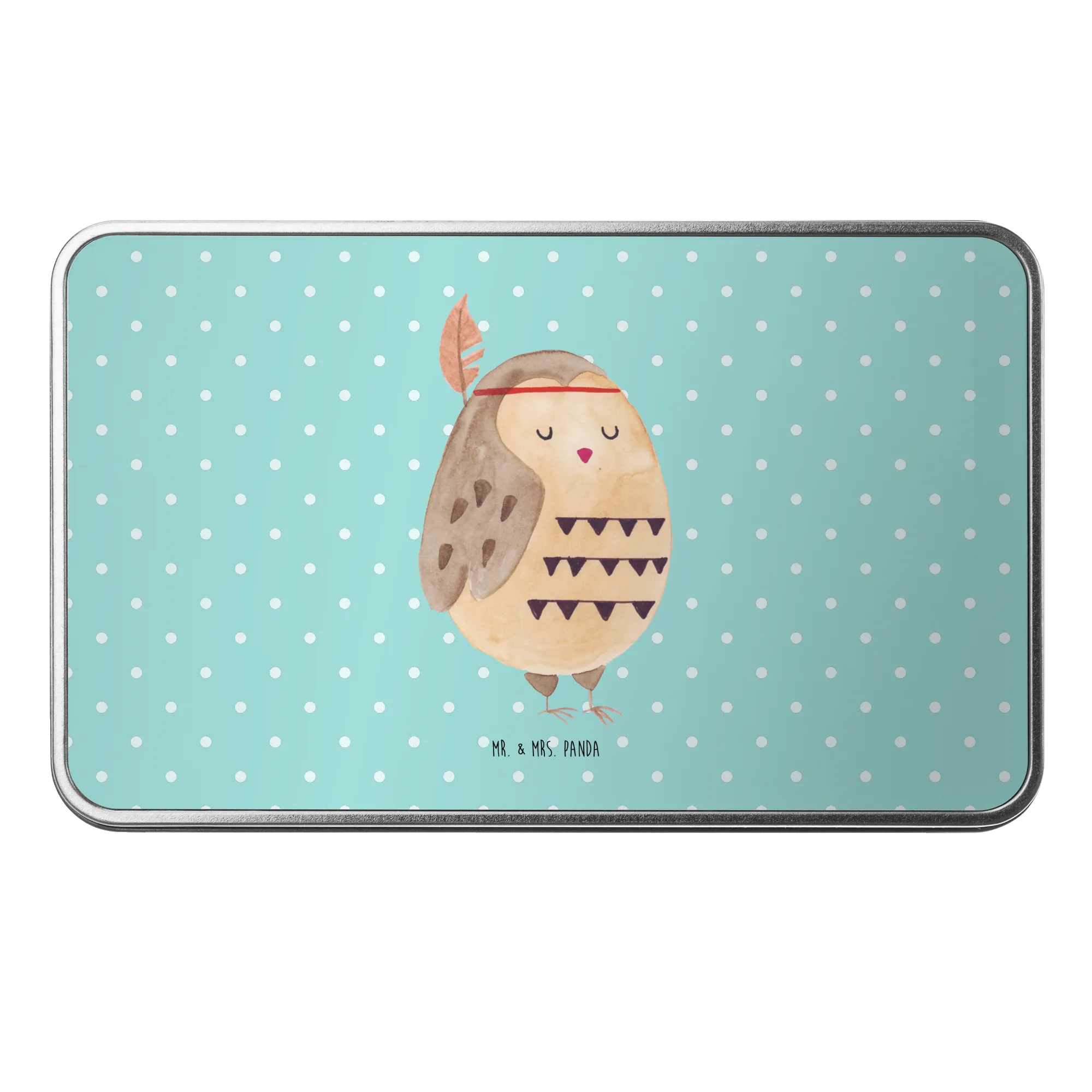 Metalowa puszka sowa Ozdoba z piór - z napisem