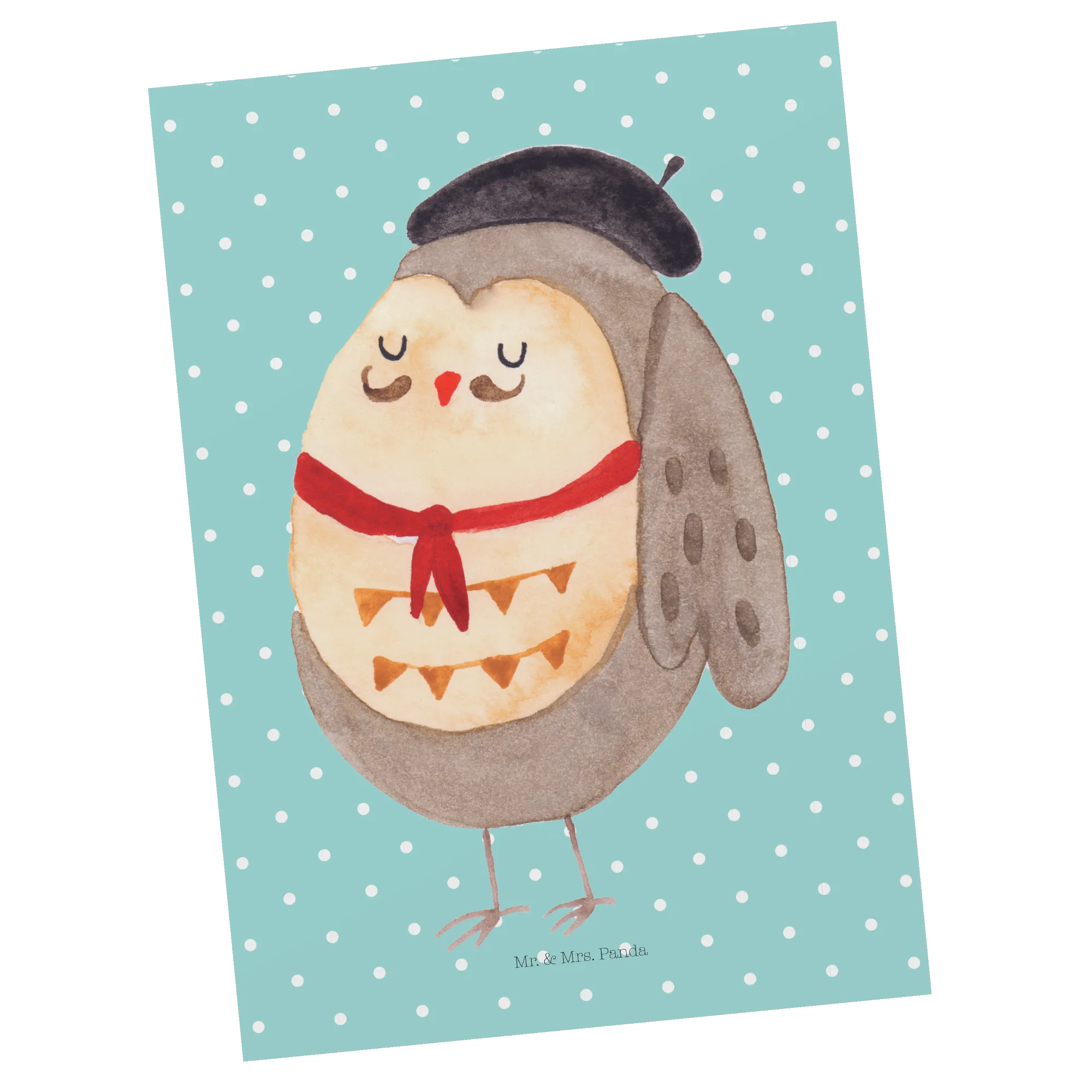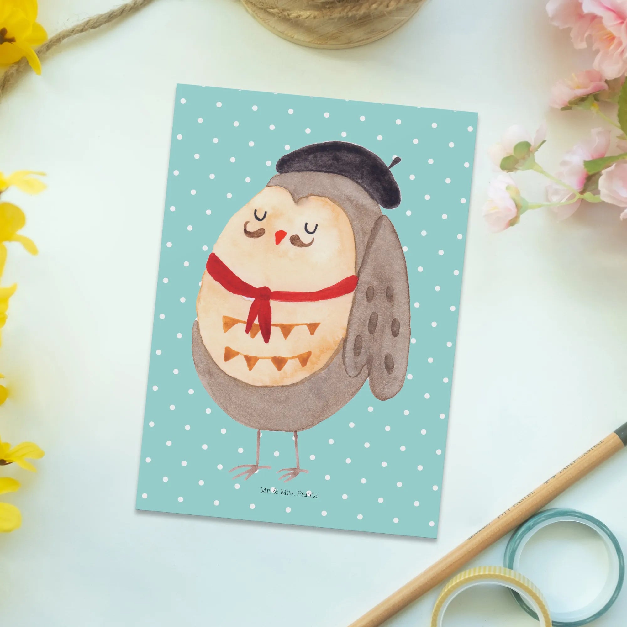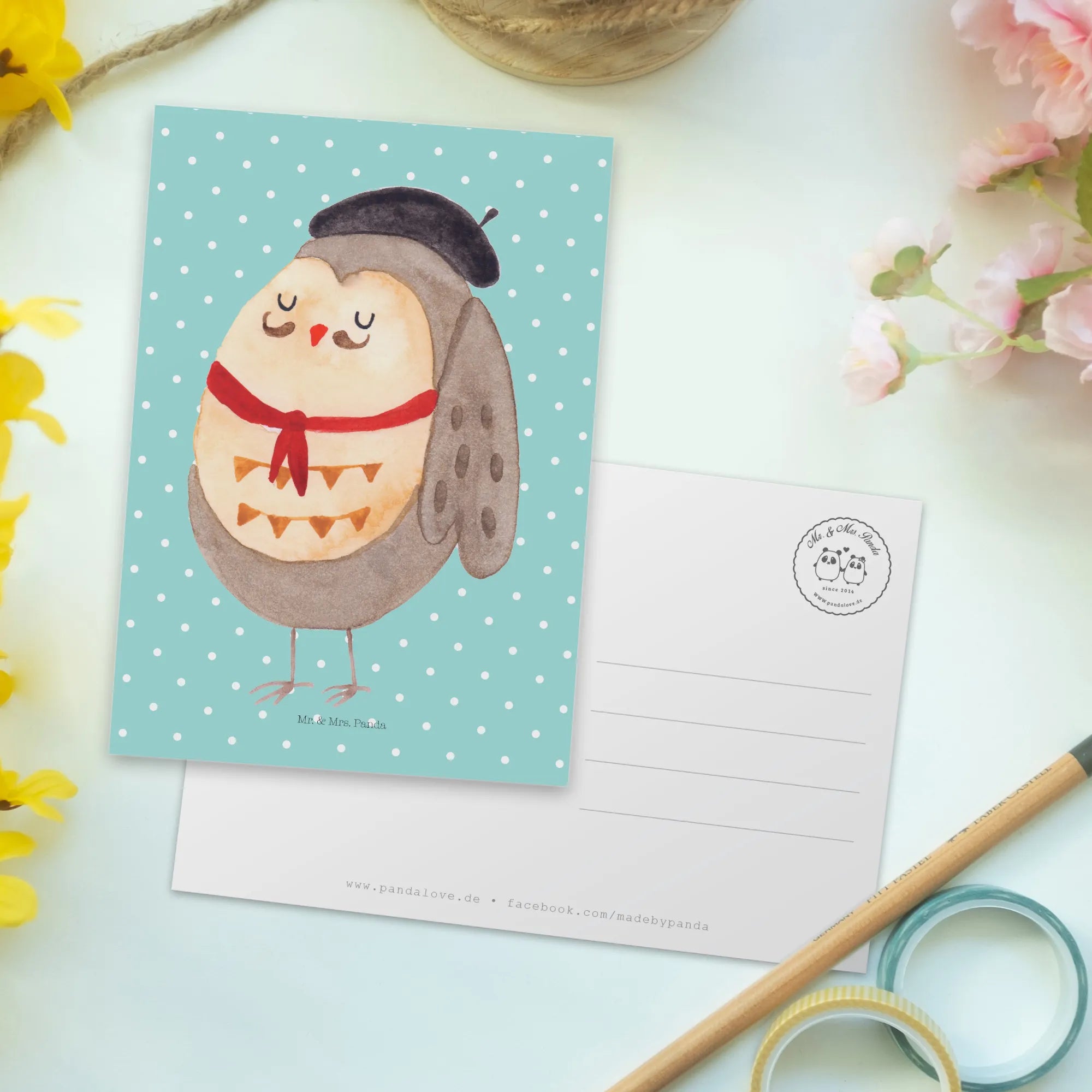 Pocztówka sowa Francja - z napisem - pastelowy turkus