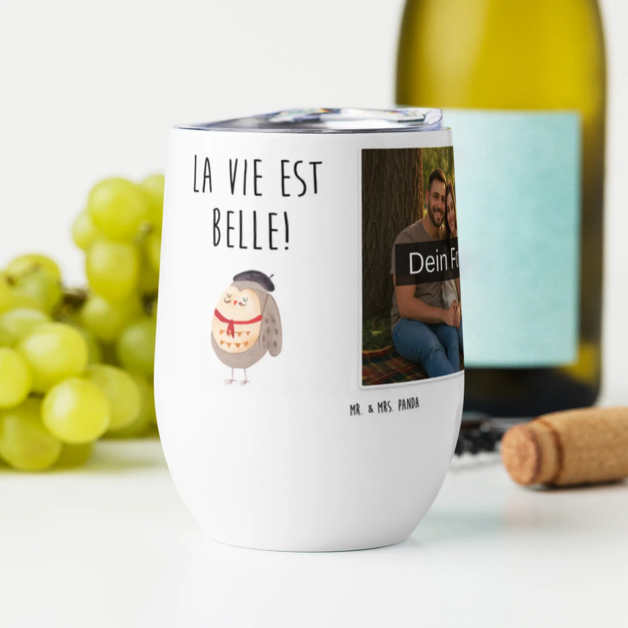 Spersonalizowany kubek do wina ze zdjęciem sowa Francja – Mr. & Mrs. Panda
