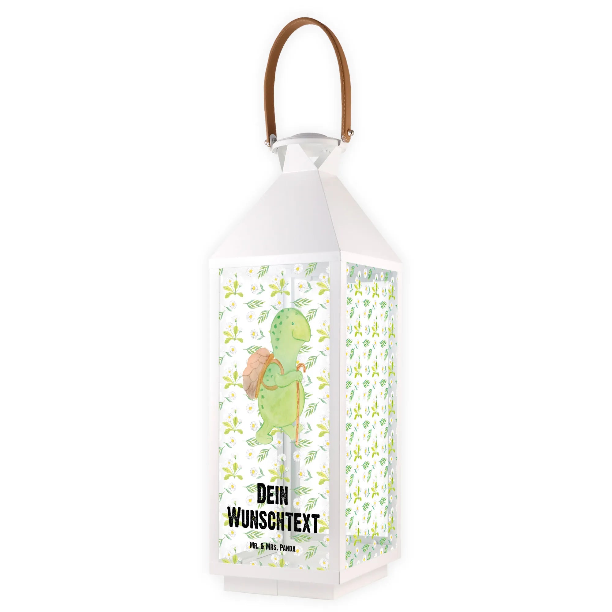 Die personalisierte Deko Laterne mit dem süßen Motiv der Schildkröte Wanderer von Mr. & Mrs. Panda ist das perfekte Geschenk für jeden Naturliebhaber und Schildkröten-Fan.