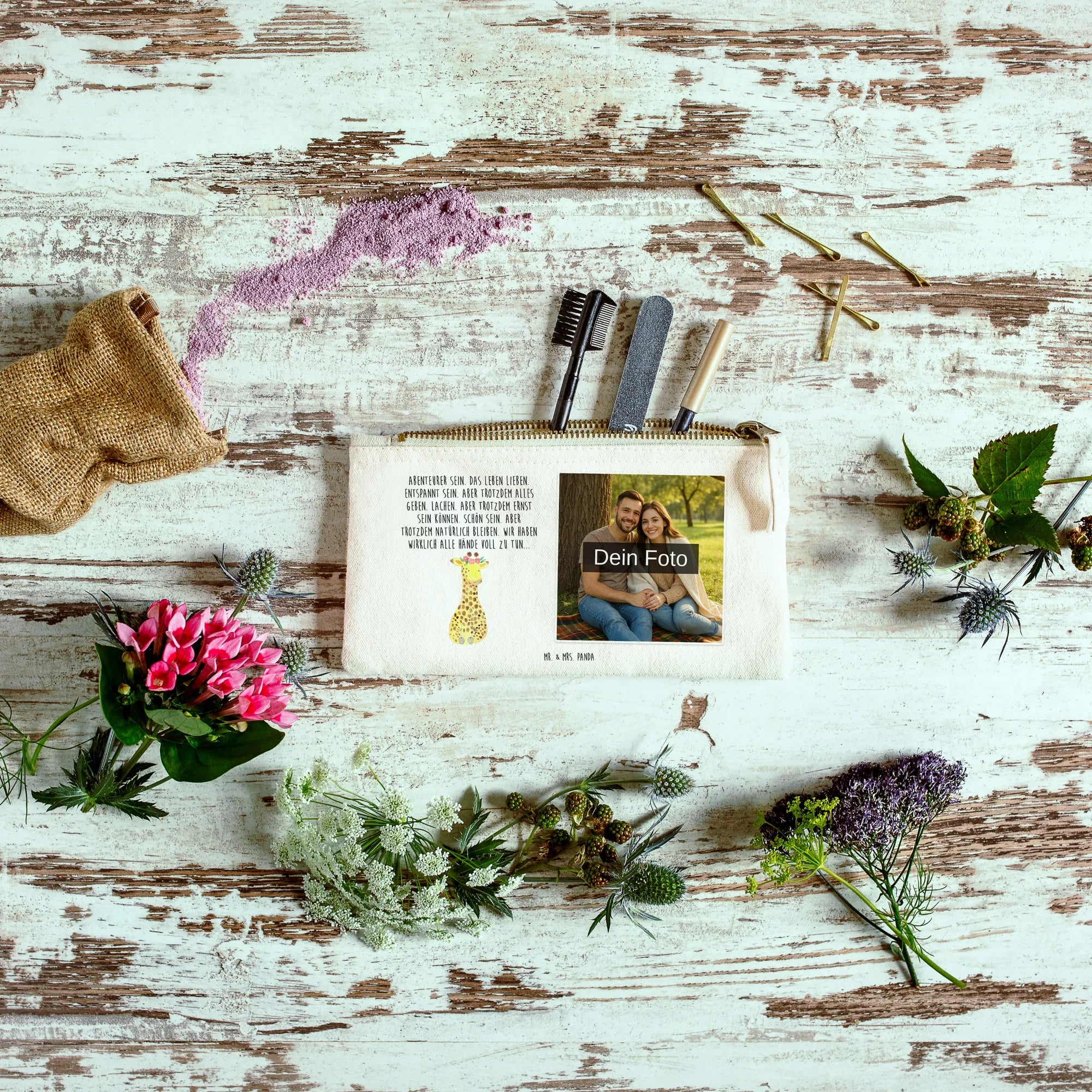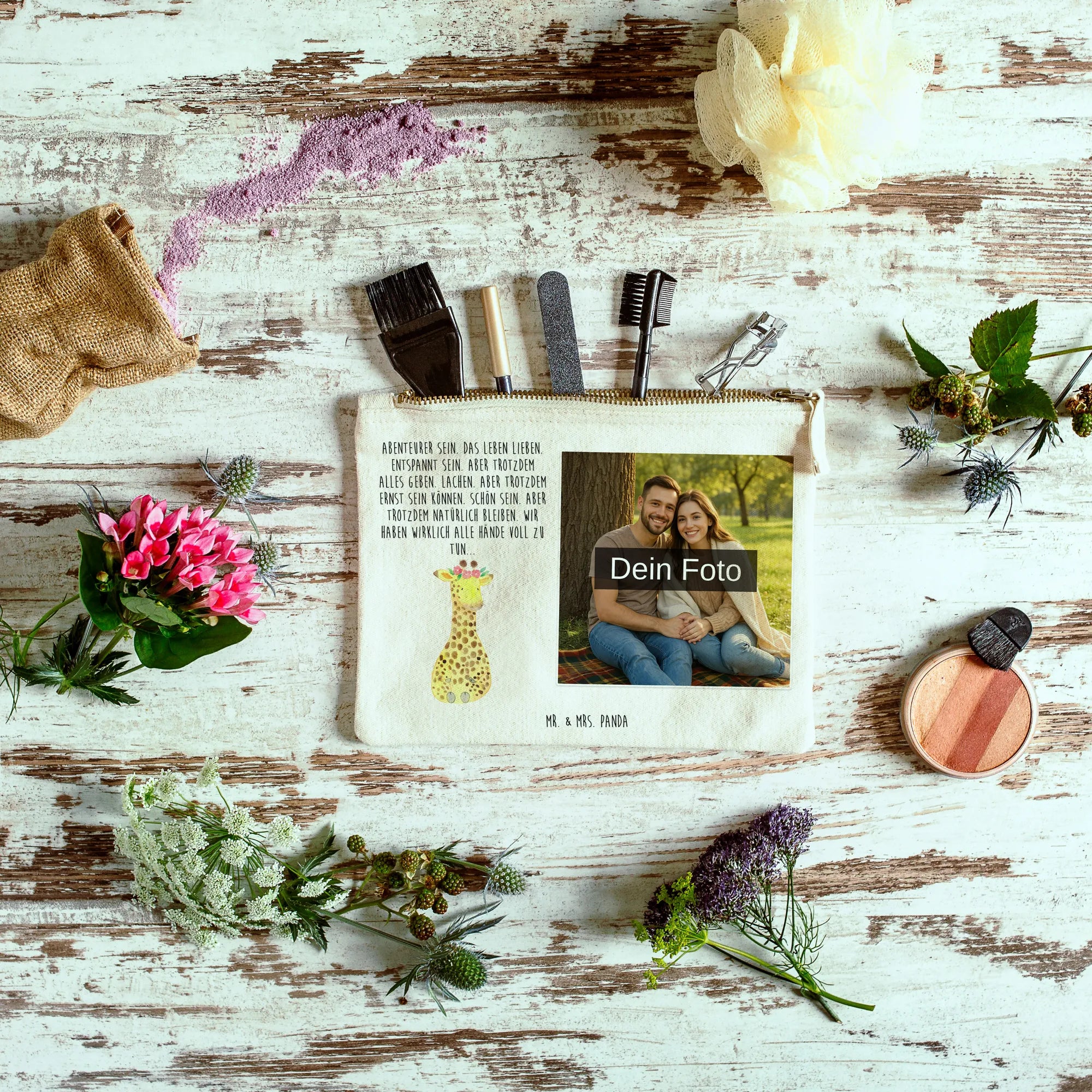 Spersonalizowana kosmetyczka ze zdjęciem żyrafa Wieniec kwiatów – Mr. & Mrs. Panda