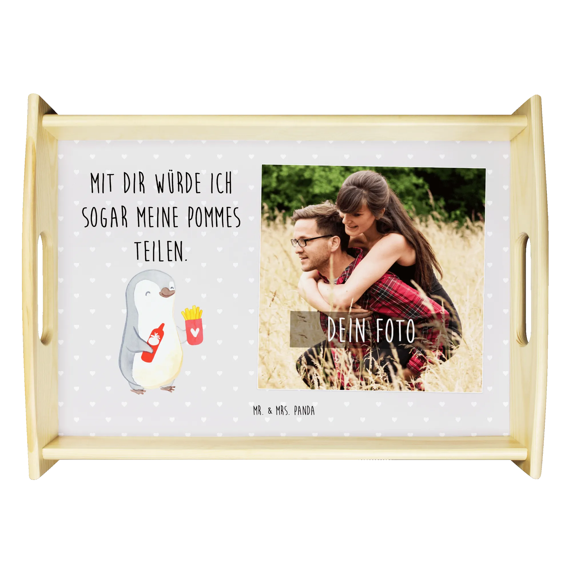 Entdecke das perfekte Geschenk für deine Liebsten mit unserem personalisierten Foto Serviertablett im bezaubernden Pinguin Pommes Design aus der Liebe Kollektion von Mr. & Mrs. Panda. Dieses einzigartige Tablett, gefertigt aus hochwertigem, lasiertem Echtholz, ist nicht nur ein praktisches Küchenutensil, sondern auch eine wundervolle Möglichkeit, deine Liebe und Zuneigung auszudrücken.