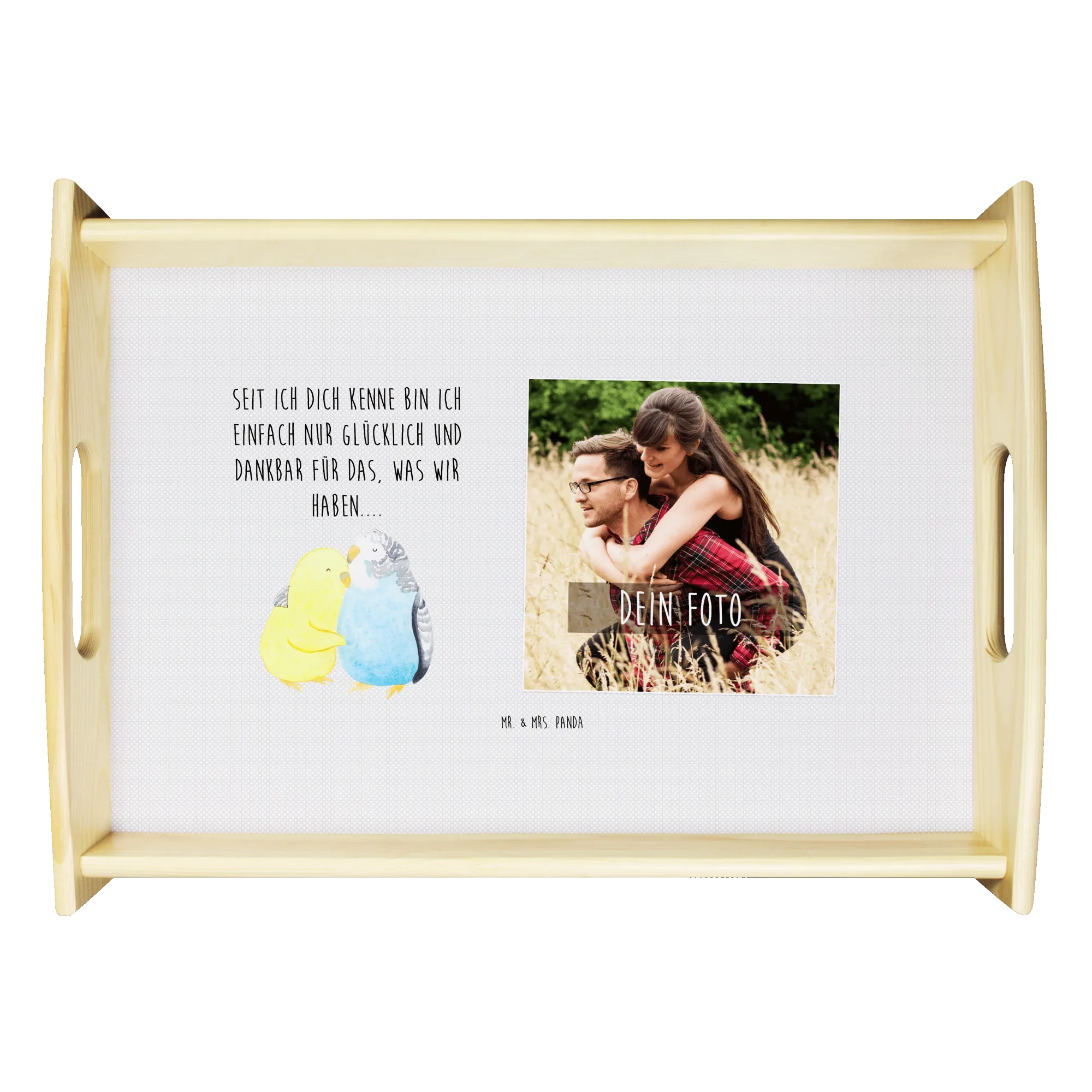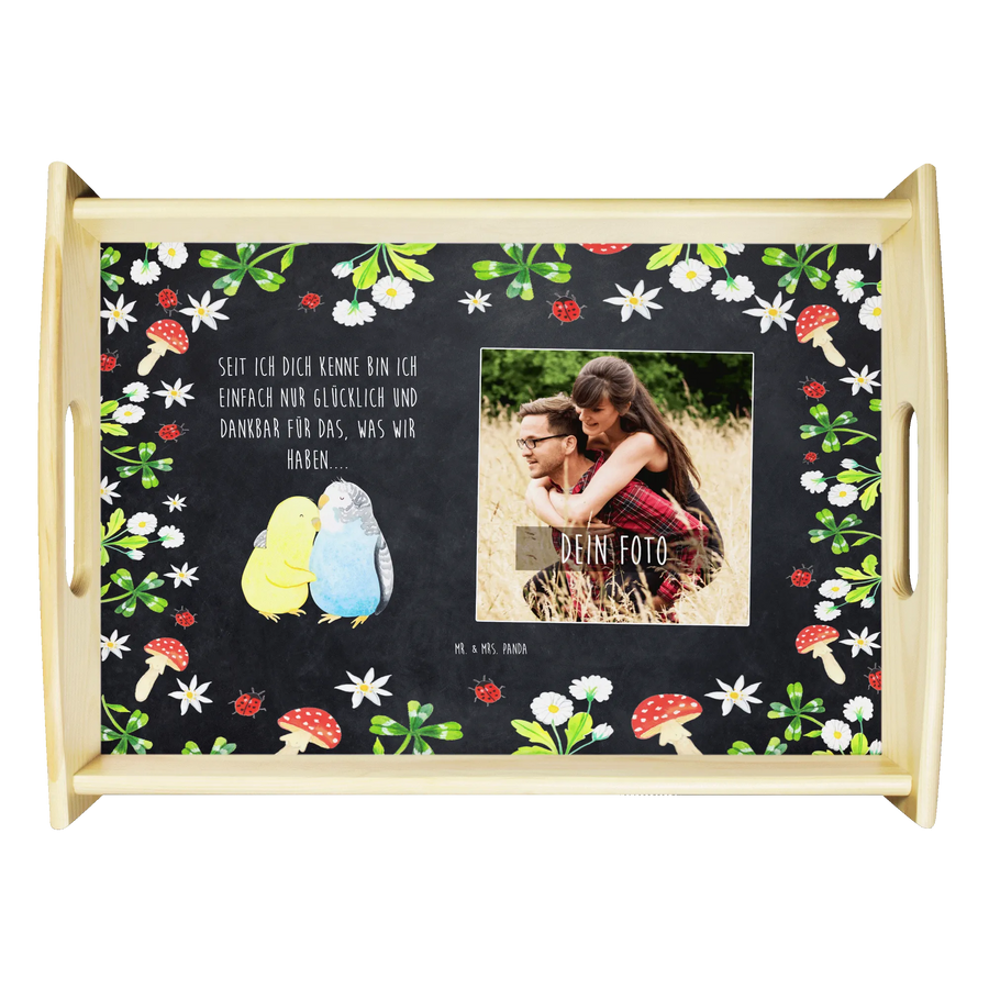 Das personalisierte Foto Serviertablett mit dem niedlichen Motiv "Wellensittich Liebe" von Mr. & Mrs. Panda ist das ideale Geschenk für all jene, die ihre Liebe oder besondere Momente gebührend feiern möchten. Ob für den Jahrestag, den Hochzeitstag oder als romantisches Liebesgeschenk – dieses liebevoll gestaltete Tablett bringt nicht nur Stil, sondern auch eine persönliche Note in jeden Haushalt. Die beiden Wellensittiche, die sich zärtlich aneinander kuscheln, symbolisieren Verbundenheit, Nähe und das innige Vertrauen, das in einer Beziehung besteht.