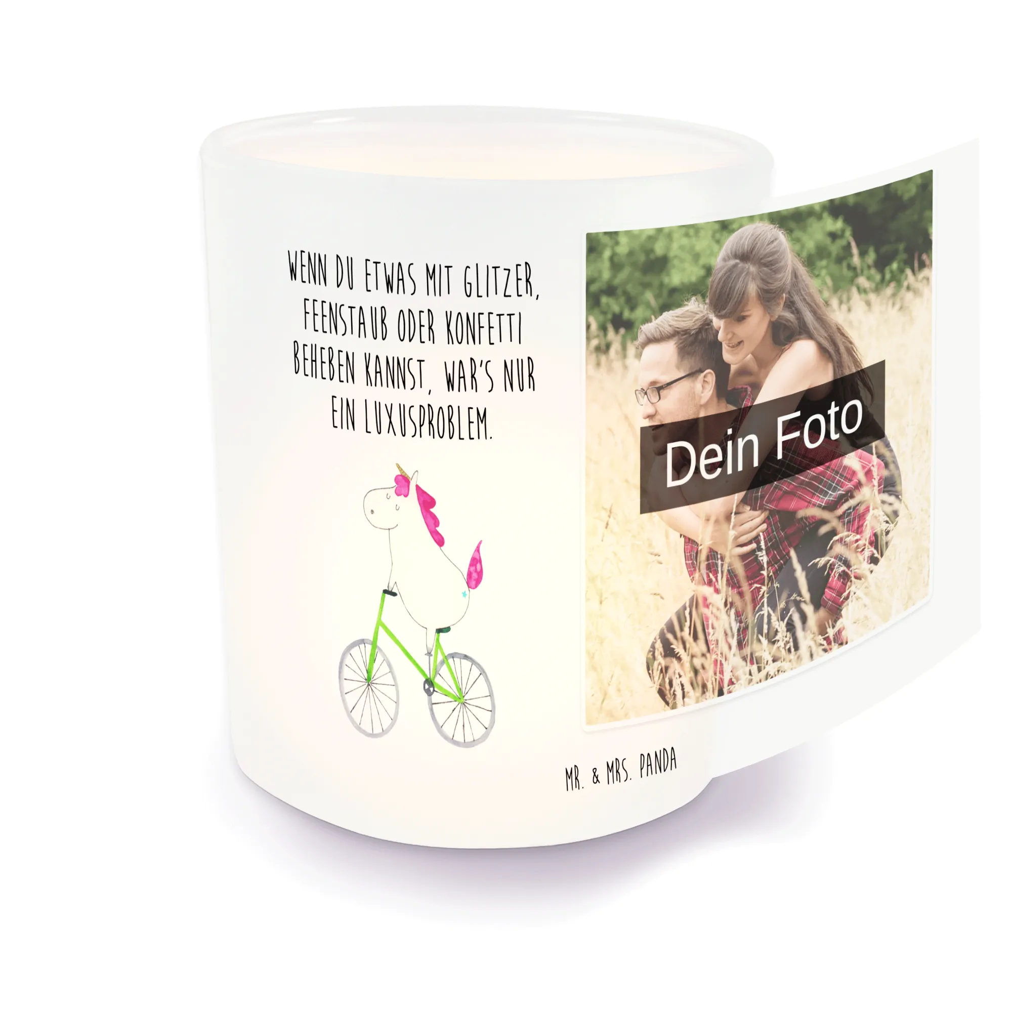Personalisiertes Foto Windlicht Einhorn Radfahrer – Mr. & Mrs. Panda