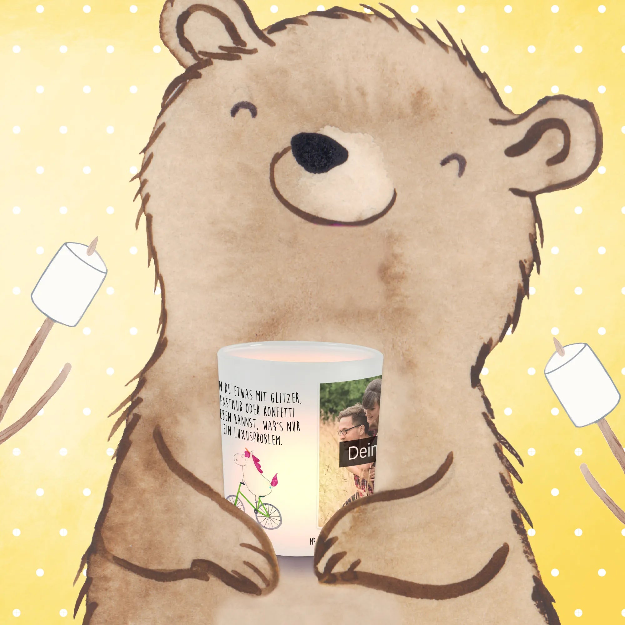 Stell dir vor, wie das sanfte Licht eines Teelichts durch das hochwertige satinierte Glas schimmert und dabei nicht nur dein Foto, sondern auch das fröhliche, radelnde Einhorn zum Strahlen bringt. Das Motiv zeigt ein Einhorn, das mit purer Lebensfreude in die Pedale tritt, begleitet von dem weisen Spruch: Wenn du etwas mit Glitzer, Feenstaub oder Konfetti beheben kannst, war's nur ein Luxusproblem.