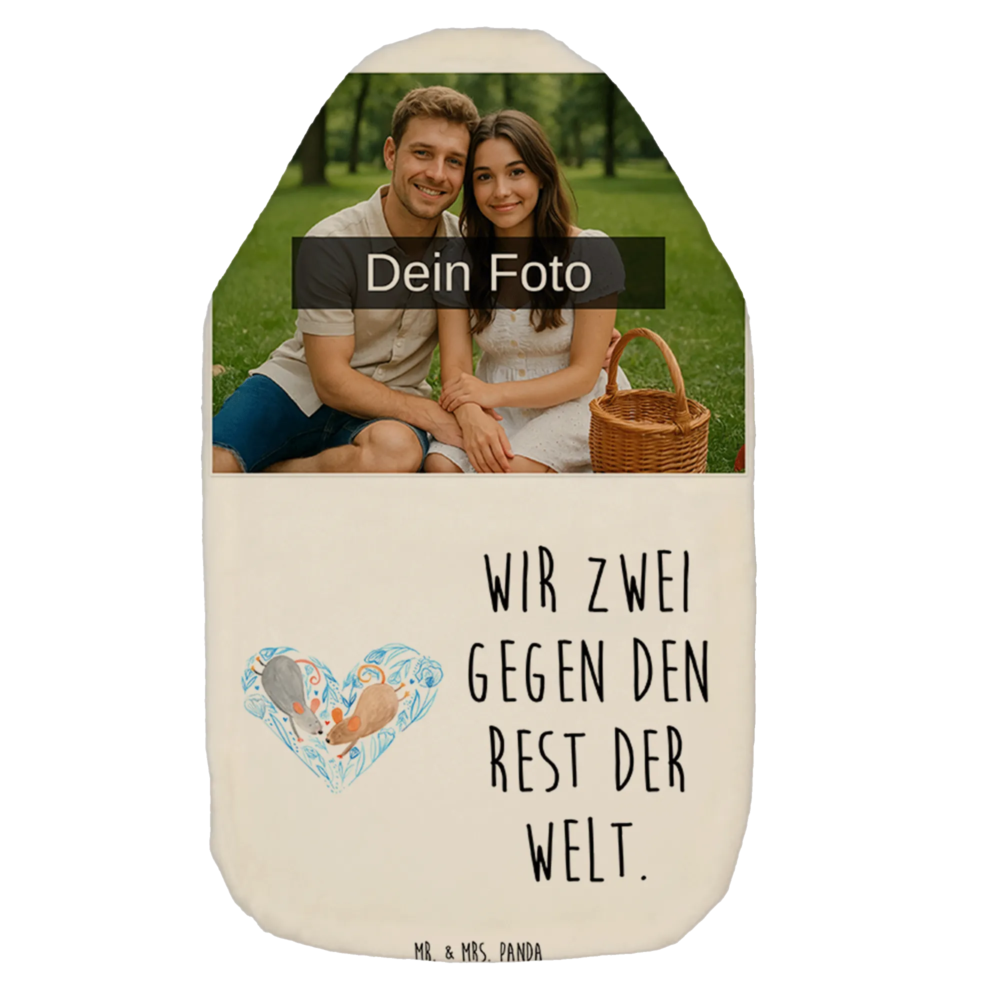 Ob zum Jahrestag, zur Verlobung oder einfach als kleines Liebesgeschenk für Deinen Lieblingsmenschen – diese Wärmflasche ist ein einzigartiges Geschenk, das von Herzen kommt. Die zarte, handgemalte Darstellung unserer beiden Mäuse, die ein Herz formen, und der Spruch "Wir zwei gegen den Rest der Welt" machen sie zu einem ganz persönlichen Ausdruck Eurer Verbundenheit.