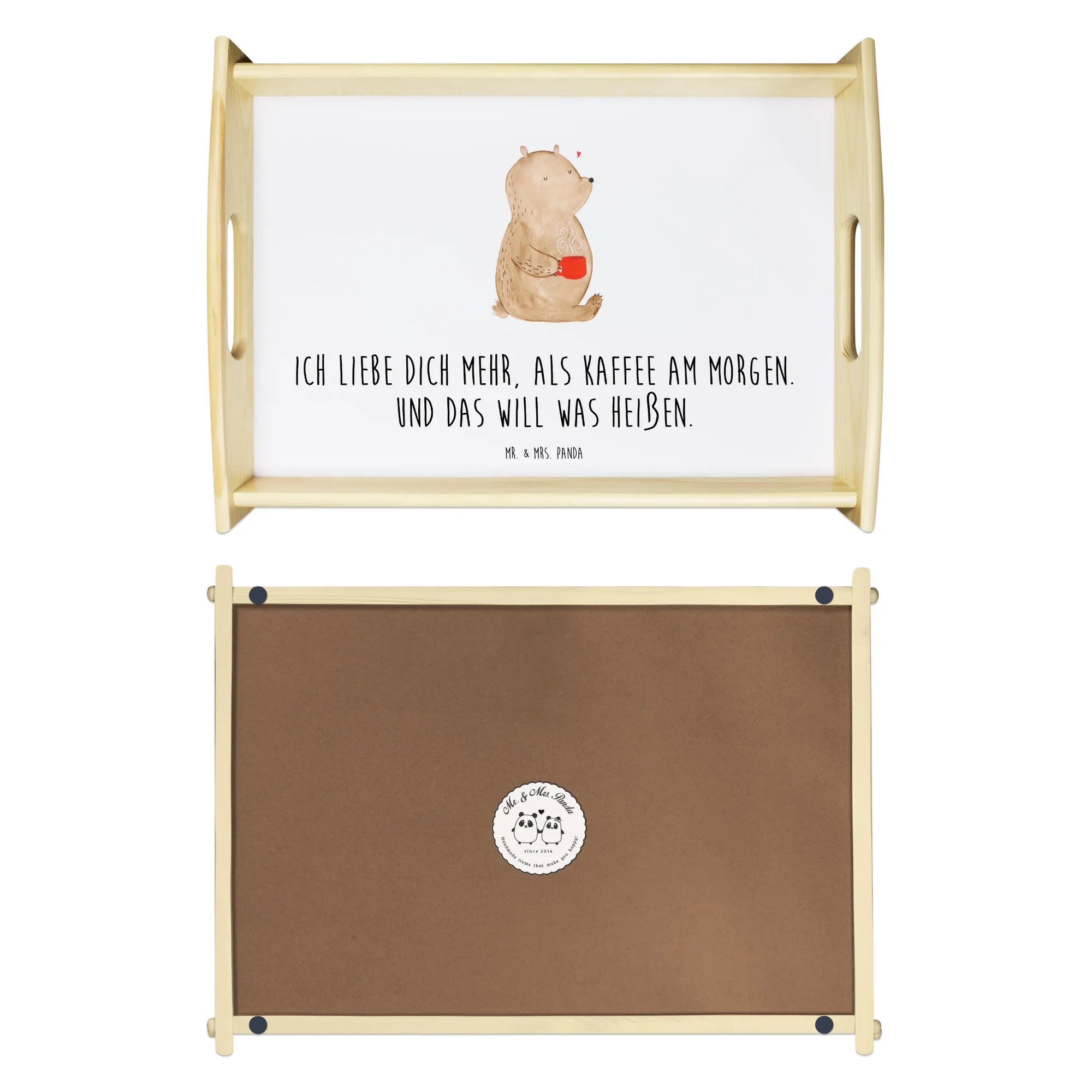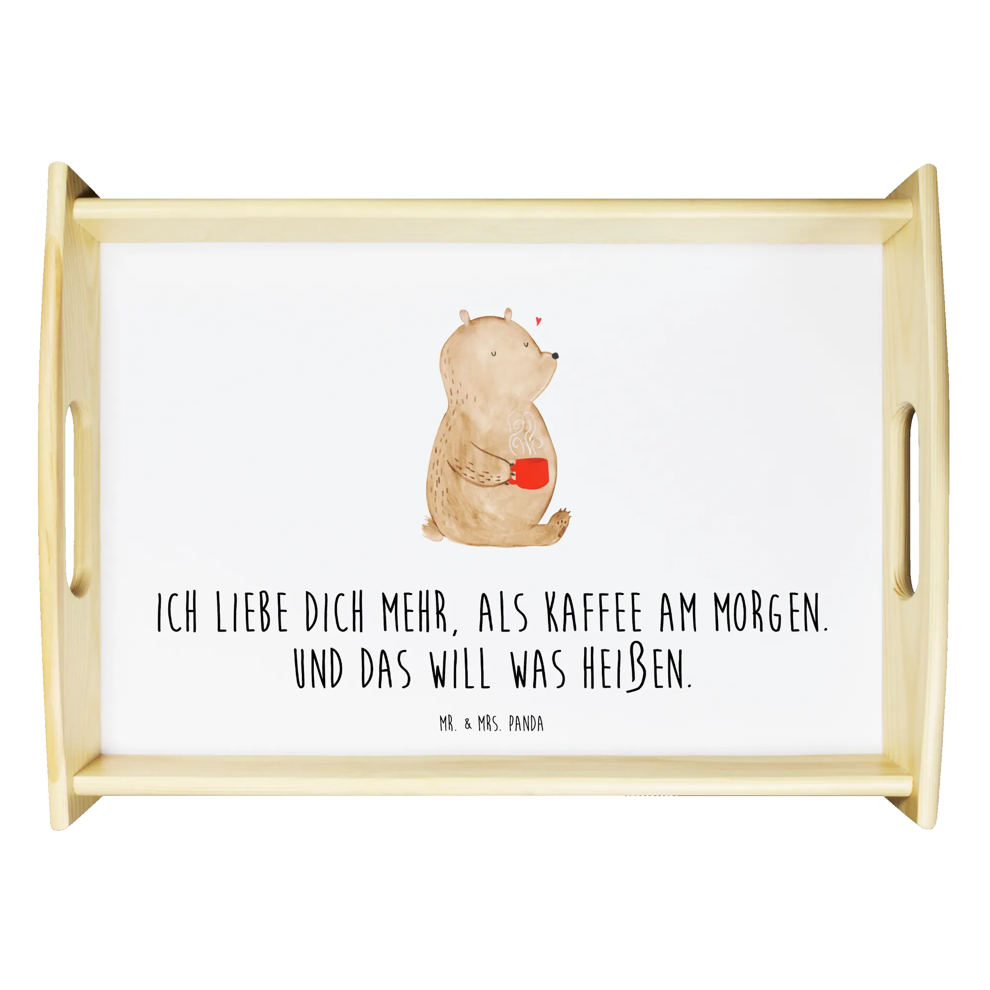 Das Herzstück dieses Tabletts ist das bezaubernde Motiv Bär Morgenkaffee. Man sieht einen rundum zufriedenen Bären, der ganz entspannt sitzt und mit seinen Pfoten eine rote Tasse umschließt. Aus dem Becher steigt heißer Dampf auf, und ein kleines rotes Herz schwebt darüber – ein Symbol für die pure Geborgenheit und das Glück, den ersten Kaffee oder Tee des Tages zu genießen. ☕