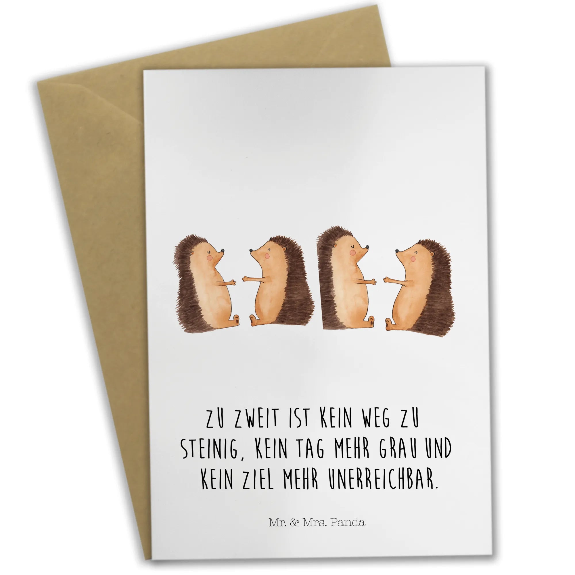 Die Grußkarte "Hochzeit Igel Liebe" aus der Mr. & Mrs. Panda Kollektion ist das perfekte Geschenk für jeden festlichen Anlass. Egal, ob du ein Hochzeitsgeschenk suchst oder einer lieben Freundin zur Verlobung gratulieren möchtest, diese Karte wird Herzen höher schlagen lassen. Mit ihrem liebevoll handgezeichneten Motiv von zwei niedlichen Igeln, die sich voller Freude gegenüber sitzen, ist sie ein wunderschönes Symbol für die Liebe und Zusammengehörigkeit. Das Motiv wird von sanften Aquarellfarben begleitet, die eine herzliche und feierliche Stimmung erzeugen.